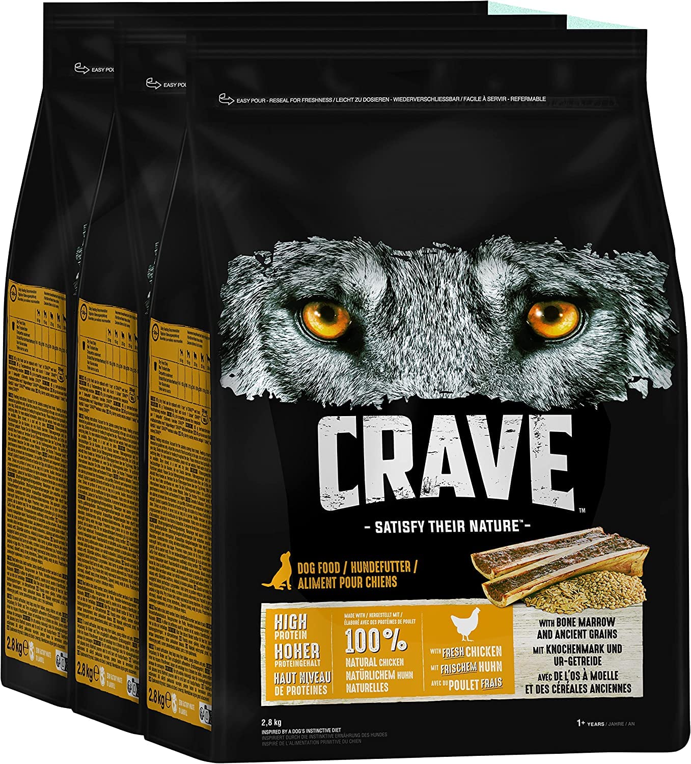 Crave premium dry food chicken with bone marrow and primeval cereals for dogs - grain -free adult dog food with high protein content - 3 x 2.8 kg chicken 8.4 kg (1 Pack)