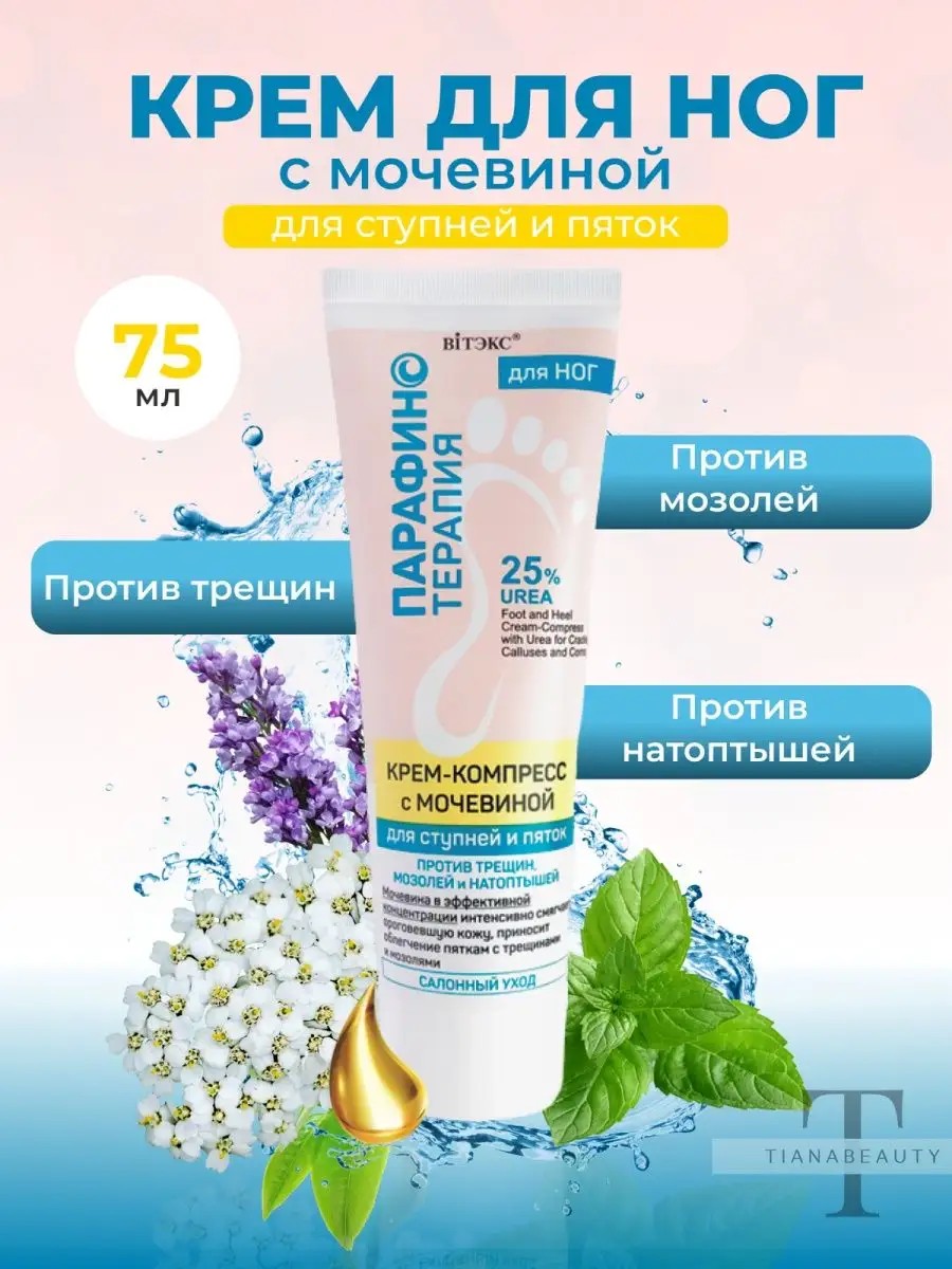 Крем-компресс с мочевиной против трещин, мазолей и натоптышей для ступней и пяток Vitex. Состав крема витэкс парафинотерапия против трещин, мозолей и натоптышей для ступней и пяток на основе мочевины отлично заполняет неровности и трещинки, помогая естественной регенерации кожи. Мочевина, входящая в состав крема для ног, в эффективно действующей концентрации - 25% - активно размягчает натоптыши и сухие мозоли, помогает легко и быстро удалить загрубевшую кожу. Природный жидкий воск в креме для пяток глубоко смягчают и увлажняют сухую кожу, интенсивно увлажняет и смягчает, уменьшает дискомфорт от трещин и мозолей. Крем с мочевиной для ног дезинфицирует кожу, ускоряет процессы регенерации, обеспечивая быстрое заживление трещин, придавая коже мягкость, гладкость и нежность. Высокоэффективный компонент крема для кожи ног - это Жидкий парафин, он используется в профессиональных косметических салонах для ухода за кожей ног. Смягчающий крем для ног от трещин и натоптышей надежно защитит пяточки от трещин, мозолей и огрубения кожи, а также увлажнит кутикулу и подготовит ногти к отличному педикюру.