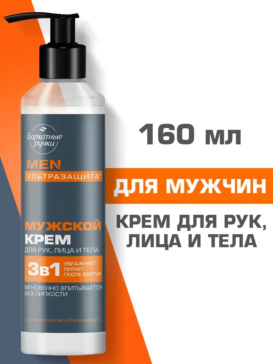 Крем для лица мужской Бархатные ручки 3 в 1 с пантенолом – это эффективное средство, которое обеспечивает коже оптимальный уход. Питательный крем для лица с витамином С из серии Ультразащита° создан специально для мужчин. Увлажняющий крем после бритья мужской 3 в 1 отлично подойдет для ежедневного ухода за кожей лица, тела и рук. Бархатные ручки крем для рук с дозатором обогащен активными ингредиентами: Д-пантенолом и витамином С. Питательный крем с витамином C для лица тонизирует кожу, повышает ее упругость. Крем для рук с пантенолом 3в1 Ультразащита° увлажняет и успокаивает кожу. Увлажняющий крем для рук Бархатные ручки эффективен как средство после бритья, крем для тела и лица. Используйте крем для рук увлажняющий и питательный 3 в 1 дома и вне его: после душа и бани, после проведения ремонтных, хозяйственных и садовых работ. Крем для тела увлажняющий 3в1 обеспечивает коже комплексный уход. Мужской увлажняющий крем для лица с дозатором имеет легкий свежий аромат, который не будет перебивать запах вашего парфюма. Крем для рук мужской 3 в 1 имеет легкую текстуру, которая мгновенно впитывается, не оставляя ощущения жирности и липкости. Бархатные ручки крем для рук увлажняющий и питательный с пантенолом смягчает сухую кожу. Свойства продукта подтверждены в ходе потребительского тестирования*. Крем увлажняющий для лица и тела 3в1 подходит для ежедневного применения. Мужской крем для рук питательный Бархатные ручки Ультразащита° – это идеальное решение для ухода за кожей! Мужской крем для лица и тела 3в1 с витамином С приятен при нанесении и представлен во флаконе с дозатором в объеме 160 мл. Увлажняющий крем для тела с дозатором – это хороший подарок для мужчин и парней на 23 февраля, любой праздник и просто так. Можно купить крем для лица мужской увлажняющий Бархатные ручки Ультразащита° своему другу, брату и коллеге. [°] в ассортименте бренда Бархатные ручки. Не является солнцезащитным средством. *при участии 100 респондентов, РФ, 2023.