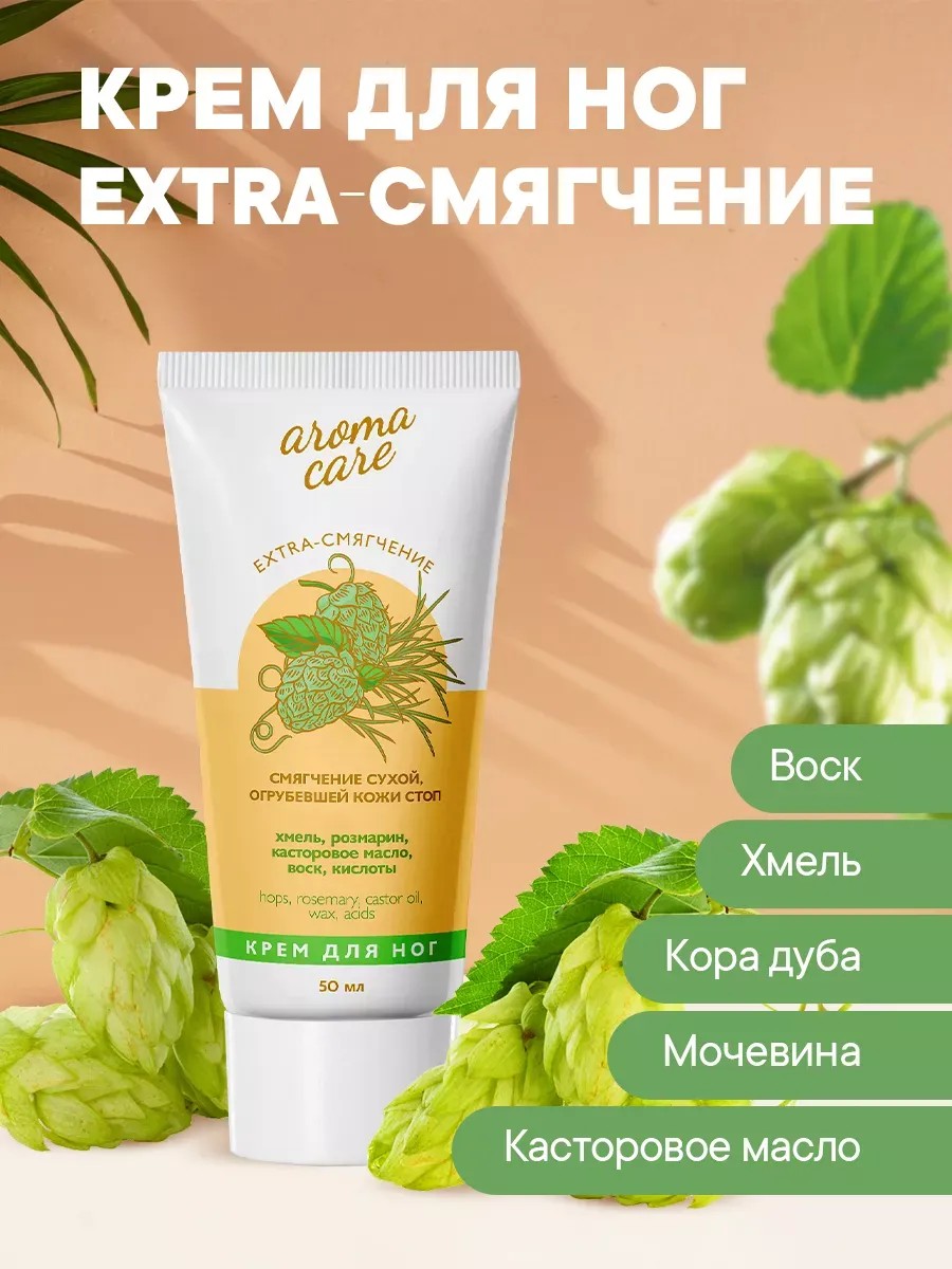 Крем для стоп 'Extra-смягчение' от популярного бранда **Aroma Care** — это уникальное средство для ухода за кожей стоп. Он поможет решить проблемы огрубевшей и сухой кожей, мозолями и трещинами. Его формула, богатая натуральными маслами и экстрактами, питает и увлажняет кожу ног, делая их красивыми и ухоженными, а воск и розмарин защищают кожу от внешних воздействий и способствуют быстрому заживлению повреждений. Регулярное применение крема поможет избавиться от мозолей, трещин и натоптышей, сделает кожу нежной и гладкой. Крем быстро впитывается, не оставляя жирной пленки, подходит для всех типов кожи, в том числе и для проблемной и чувствительной кожи. Он обладает эффектом размягчения мозолей, увлажнения и защиты от появления трещин. В состав крема входят хмель, вытяжка из розмарина, касторовое масло и мочевина. Крем для ног **Aroma Care** также может использоваться для принятия ванн и душа. Средство подходит для ухода за ногами и стопами, сохраняя их красоту и здоровье. Упаковка крема удобная и компактная, что позволяет легко брать его с собой в поездки или на работу. Подойдет как для взрослых, так и для детей, ведь крем не имеет в своем составе вредных веществ, таких как парабены и силиконы, а также не тестируется на животных, что делает его безопасным в использовании.