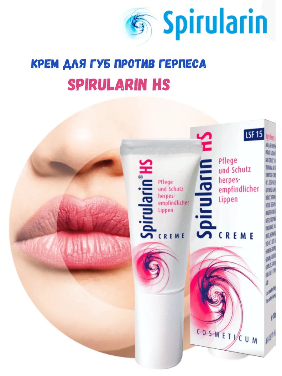 Spirularin HS Spirularin cream for herpes is a lip care cream that contains unique ingredients. After application, the feeling of pain, tension, tightness and burning is relieved. Special glucose molecules contained in Spirularin HS cover healthy skin cells with an invisible protective film that prevents the penetration of viruses. / Product features: - Care and protection before prolonged exposure to the sun, in the cold; - Restoration of the mucous membrane in atopic dermatitis and oral herpes; - Care and protection during lip shape correction with hyaluronic acid injections; - Restoration and protection before and after permanent makeup and tattoo procedures; - Help with herpes zoster, molluscum contagiosum; / Spirularin HS can be safely used by children, diabetics, pregnant women and nursing mothers. You can use decorative lipstick over Spirularin HS cream. / Directions for use: This product is recommended for the following cases: For care and protection. For oral herpes and atopic dermatitis, apply twice daily. If necessary, apply up to 5 times to the affected area. / Also apply to lips before prolonged sun exposure. The cream relieves tightness, burning, and pain. Fewer cracks and crusts form. Herpes scars are virtually eliminated. Affected areas are smoothed out. After hyaluronic acid injections to reshape the lips. Apply the product to the lips twice daily for a week before the injection. It relieves tension in the injection area. After permanent lip makeup. Apply the cream a week before the procedure, twice daily—day and evening. Continue using the product in the same manner after the procedure. If necessary, increase the number of applications up to 5 times daily. This reduces tension and pain, and reduces the formation of crusts. Rapid restoration and healing of the skin on the lips occurs.