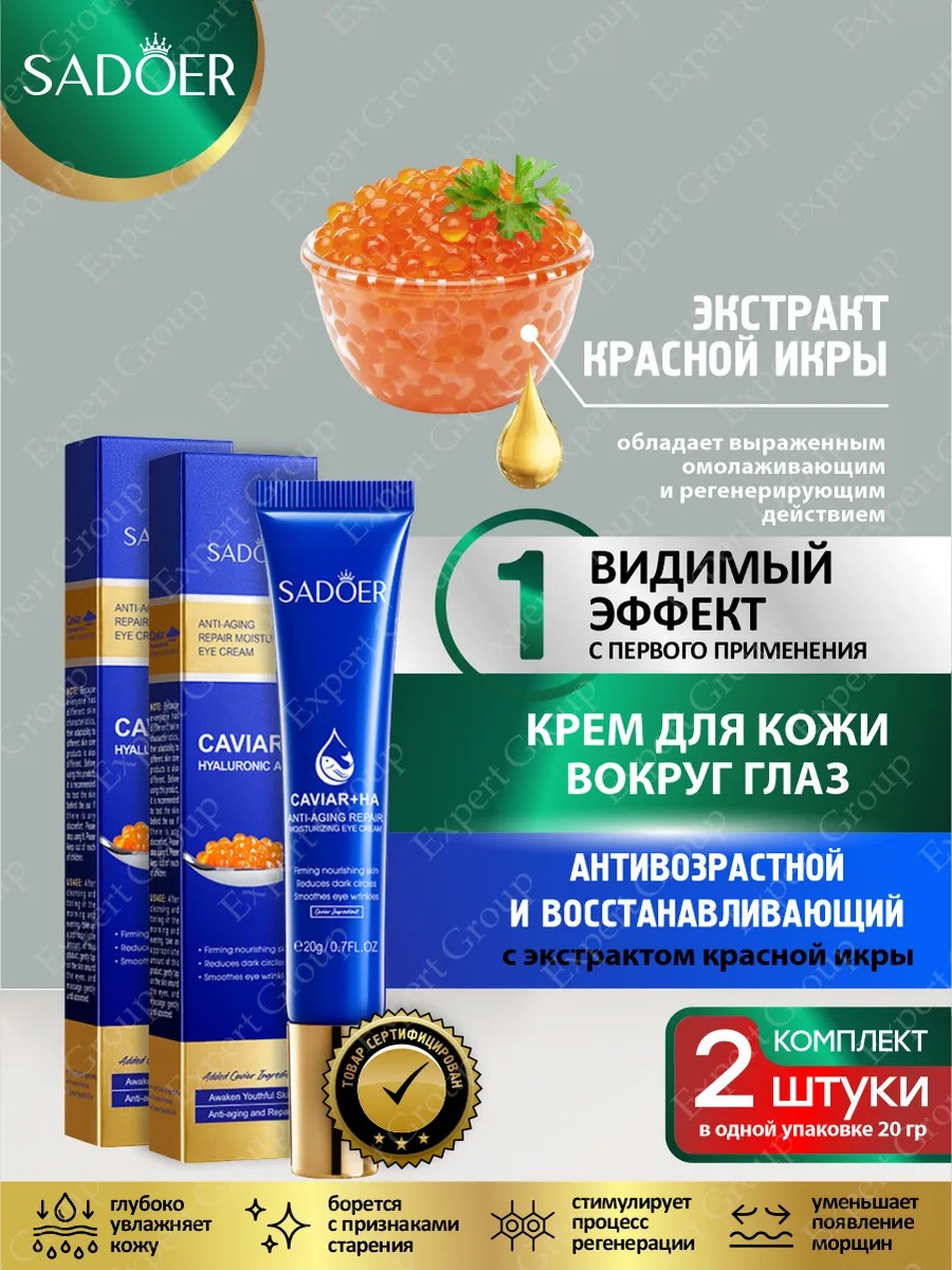 | Комплектация | Антивозрастной крем для кожи вокруг глаз Sadoer с экстрактом красной икры 20 гр х 2 шт. |