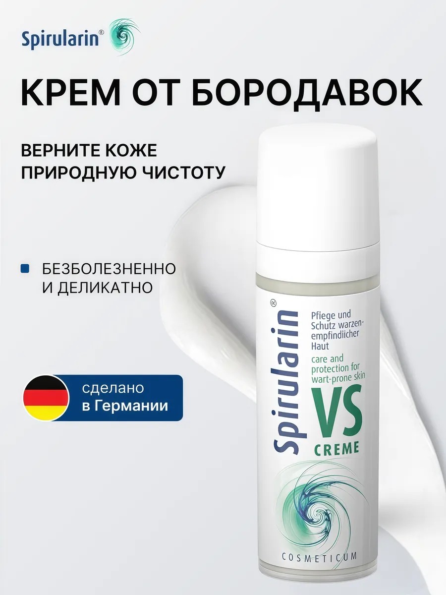Крем Spirularin VS обладает защитным, восстановительным эффектом. Средство идеально подходит для эффективного избавления от бородавок и папиллом. Spiralin - главный ингредиент крема, создан на основе микроводоросли спирулина, он препятсвует проникновению в здоровую клетку вирусов и бактерий.Эффект:- защита от вирусов, грибов, бактерий;- местное воздействие на бородавки и папилломы;- регенерация кожи в пораженных местах;- естественная борьба с вирусом папилломы человека без привыкания и аллергических реакций.Активные ингредиенты:- Spiralin - компонент на основе водоросли спирулина (защита от бородавок, вирусов, бактерий; запуск процесса регенерации кожи);- экстракт коры белой ивы (обладает дубильными свойствами, обеспечивает вяжущий эффект);- экстракт корня солодки (снижает чувствительность кожных покровов);- масло семян подсолнечника (питает, смягчает кожные покровы);- масло розмарина (антибактериальный эффект).