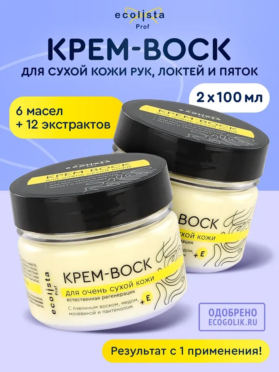 Крем воск Ecolista с первого применения поможет в борьбе с сухостью, трещинками и шелушением кожи. Воск обеспечивает питание и увлажнение сухой, огрубевшей и потрескавшейся коже, ускоряет ее регенерацию. Уникальная комбинация натуральных компонентов: 6-ти масел, 12-ти растительных экстрактов, витамина Е и Д-пантенола обеспечивает максимальную пользу для кожи рук, ног и сухих участков тела. Пчелиный воск заживляет трещинки и шелушения. Мочевина увлажняет и смягчает даже очень сухую и огрубевшую кожу. Пантенол увлажняет, успокаивает и помогает в быстром восстановлении. Масло Ши, кокоса, какао и других полезных масел максимально насыщают кожу полезными свойствами, ускоряют ее регенерацию. Крем воск с мочевиной прекрасно подойдет в качестве ухода за руками, ногтями и кутикулой - увлажняет и питает, делая кожу бархатисто-мягкой и нежной. Крем с пантенолом отлично подойдет для пяток - поможет в борьбе с трещинами, шелушением, натоптышами и станет незаменимым помощником в уходе за кожей ног. Воск для очень сухой кожи рук и ног легко и быстро впитывается и не оставляет чувство липкости. Для удобства нанесения в комплекте есть лопатка.