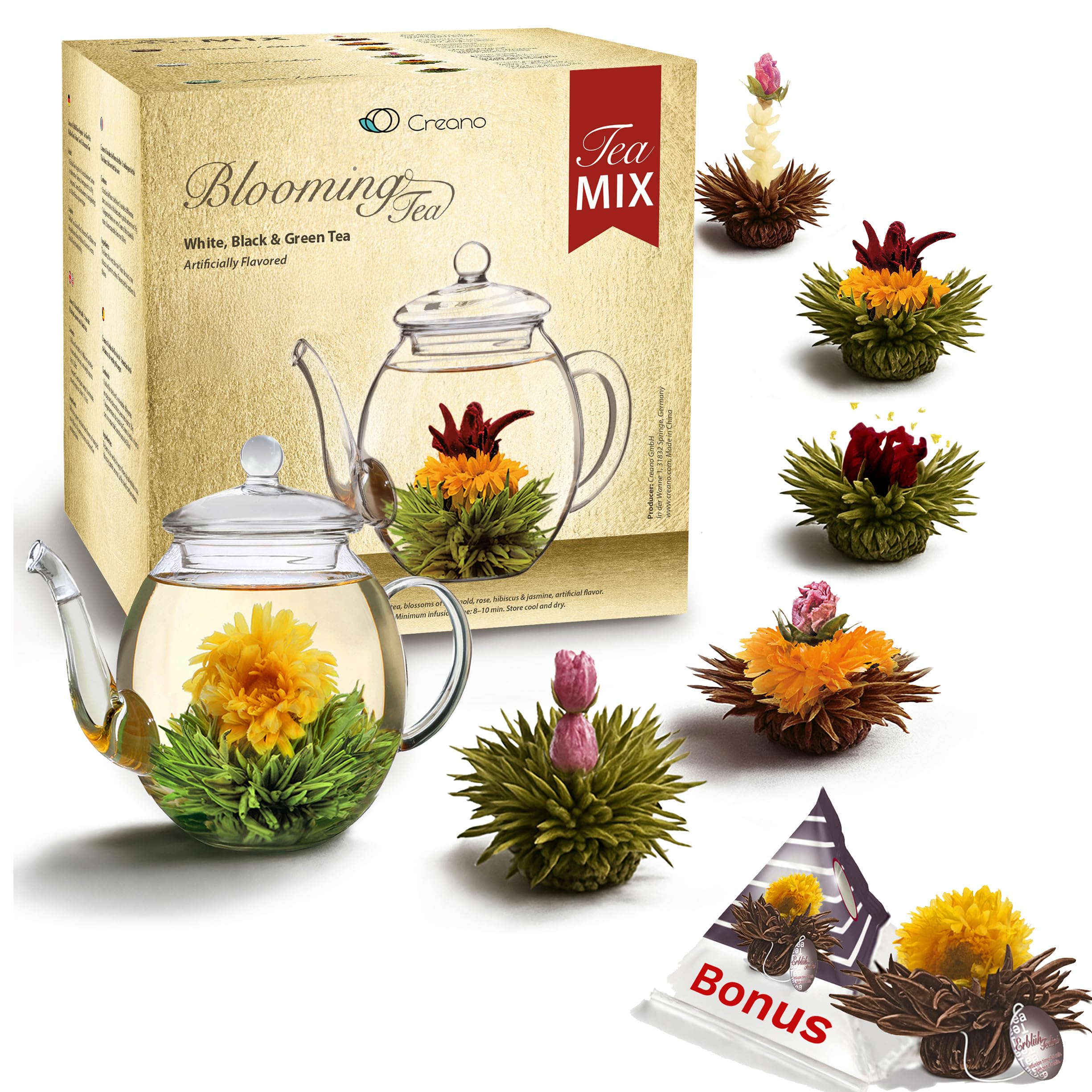 Ready to Taste: The ideal all-in-one gift set that includes everything you need to begin your sensory experience as soon as you open it. Handcrafted and Naturally Flavored: Each piece is hand-tied and combines the finest tea leaves with real flowers and fruity aromas (mango, raspberry). Unfurling Spectacular: Watch in awe as each sphere slowly unfolds to reveal a magnificent exotic flower at the heart of your teapot. 100 Drip-Free Teapot Included: Enjoy a 500ml mouth-blown borosilicate glass teapot, guaranteeing a perfect and clean pour without a single drip. Tea Trio Bonus Teelini: An exclusive blend of 6 handcrafted Flowering Teas (White, Green, Black) with an additional single-serve flowering tea.Prêt pour la dégustation: Le coffret cadeau idéal "tout-en-un" qui inclut tout le nécessaire pour commencer immédiatement ton expérience sensorielle dès l'ouverture. Artisanat et arômes naturels: Chaque pièce est liée à la main et associe la noblesse des feuilles de thé à de véritables fleurs et des arômes fruités (mangue, framboise). Spectacle d'éclosion: Observe avec émerveillement chaque sphère se déployer lentement pour révéler une fleur exotique magnifique au cœur de ta théière. Théière 100 sans goutte incluse: Profite d'une théière de 500ml en verre borosilicate soufflé à la bouche, garantissant un service parfait et propre sans la moindre goutte. Trio de thés Bonus Teelini: Un mélange exclusif de 6 Fleurs de Thé artisanales (Blanc, Vert, Noir) avec une fleur de thé supplémentaire en format portion de tasse.Creano Coffret d'Or Fleurs de Thé Mix 6 pcs 1 Teelini Bonus (Portion de Tasse) – Théière en Verre 500ml sans goutte – Thé Blanc, Vert Noir – Idée Cadeau Chic