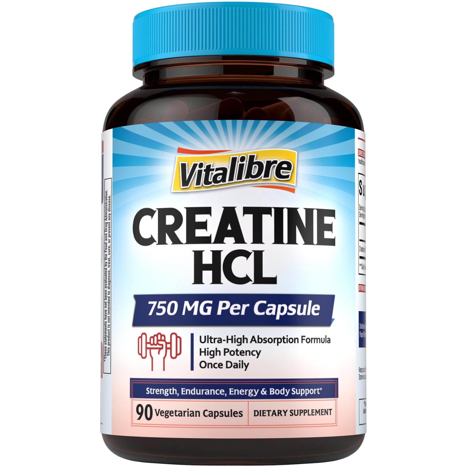 Made With You In Mind: From meticulously sourcing the finest, most bioavailable ingredients to rigorously testing each formula, the team behind Vitalibre is driven by a relentless pursuit of purity and potency. We're committed to transparency in labeling and providing clear information contains zero sugar, gluten, dairy, soy, wheat, eggs, tree nuts peanuts. High Quality And Value: We are proud to affirm all Vitalibre products are manufactured in the U.S in facilities that adhere to strict Good Manufacturing Practices (GMP) guidelines. Every Vitalibre product is tested by qualified third parties including Labdoor, NSF and Eurofins for the highest quality. Enhanced Power Explosive Strength Support - Think of creatine as a turbocharger for your cells, giving them more power when needed! Our creatine promotes rapidly ATP regeneration, providing cellular energy to all your cells to support cognitive function, immune support, and heart health. . No Loading Phase Required - Fast Results - Unlike traditional creatine monohydrate requires a 5-7 day loading phase with high doses, Vitalibre Creatine HCl begins working without the need for loading.The efficient absorption of Creatine HCl helps you achieve exercise goals faster while maintaining convenience in your supplementation routine. Superior Creatine HCl Formula For Maximum Absorption - Each capsule contains 750mg of pure Creatine Hydrochloride (HCl), a highly soluble and bioavailable form of creatine that offers superior absorption compared to traditional creatine monohydrate. The hydrochloride form also requires smaller serving sizes to achieve the same benefits as larger doses of monohydrate. .