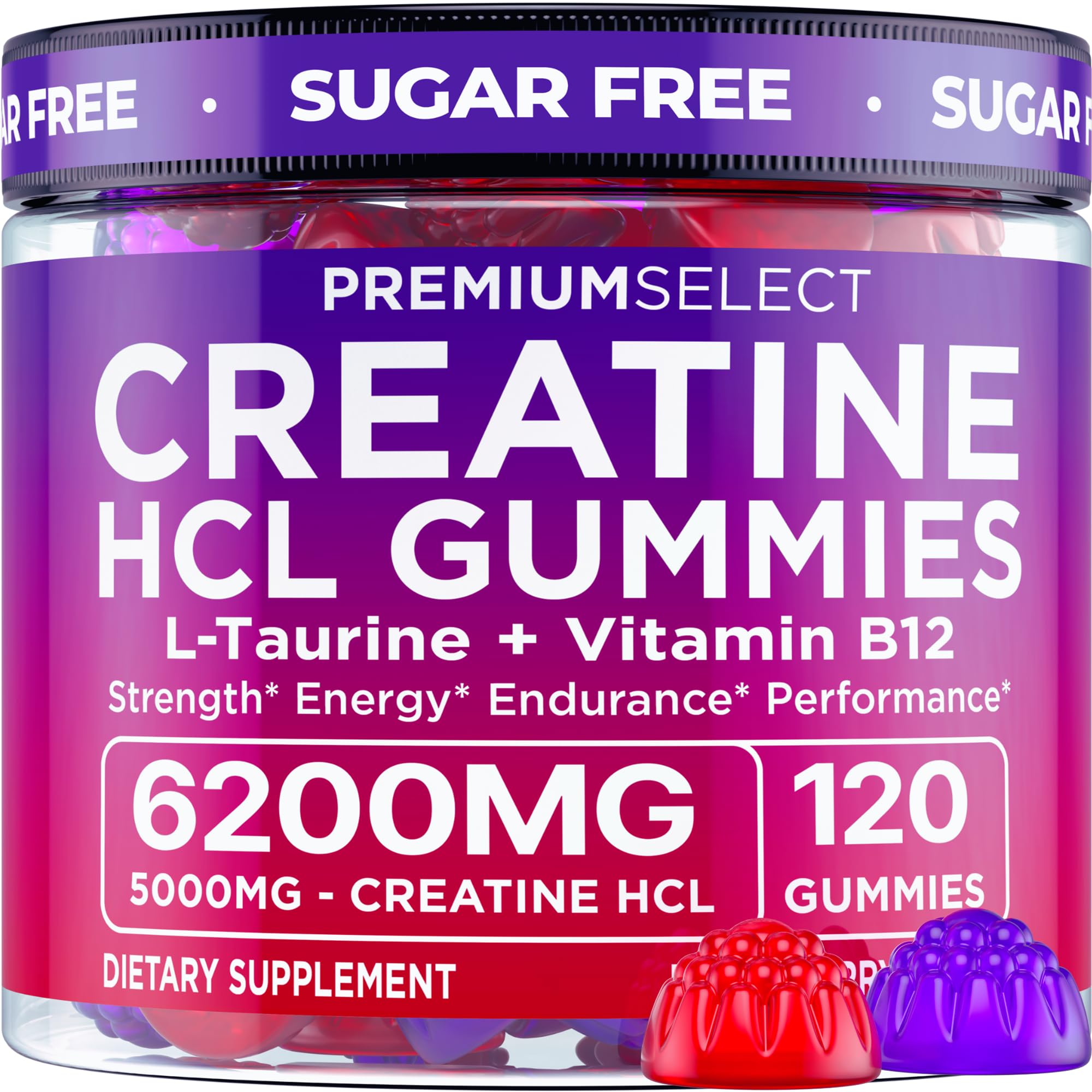 TWO PER DAY EASY TO TAKE GREAT TASTING (1-MONTH SUPPLY) - Take just two great-tasting gummies per day. Each bottle contains 60 gummies (30 servings), making it simple to stay consistent with your performance, strength, and recovery goals. SUGAR FREE, VEGAN FRIENDLY CLEAN INGREDIENTS - Formulated with naturally sweetened, plant-based ingredients. These gummies are vegan, non-GMO, and free from added sugar, gluten, soy, dairy, gelatin, and artificial additives—clean and effective support you can trust. SUPPORTS STRENGTH, STAMINA DAILY PERFORMANCE - Creatine helps supply energy to muscles during intense activity, taurine supports blood flow and hydration, and B12 helps convert food into usable energy. This blend supports peak performance without stimulants or crash. 6200MG ADVANCED COMPLEX – HIGH POTENCY FORMULA - Our triple-action blend features fast-absorbing creatine HCL to support muscle performance, L-taurine to aid hydration and workout endurance, and vitamin B12 to assist with energy metabolism and daily wellness. CREATINE HCL GUMMIES FOR STRENGTH, ENERGY RECOVERY - These premium creatine HCL gummies are formulated to support clean energy, strength, and faster recovery. Each serving delivers 5000mg of creatine hydrochloride, 1000mg of L-taurine, and 200mcg of vitamin B12 to fuel lean muscle and performance.
