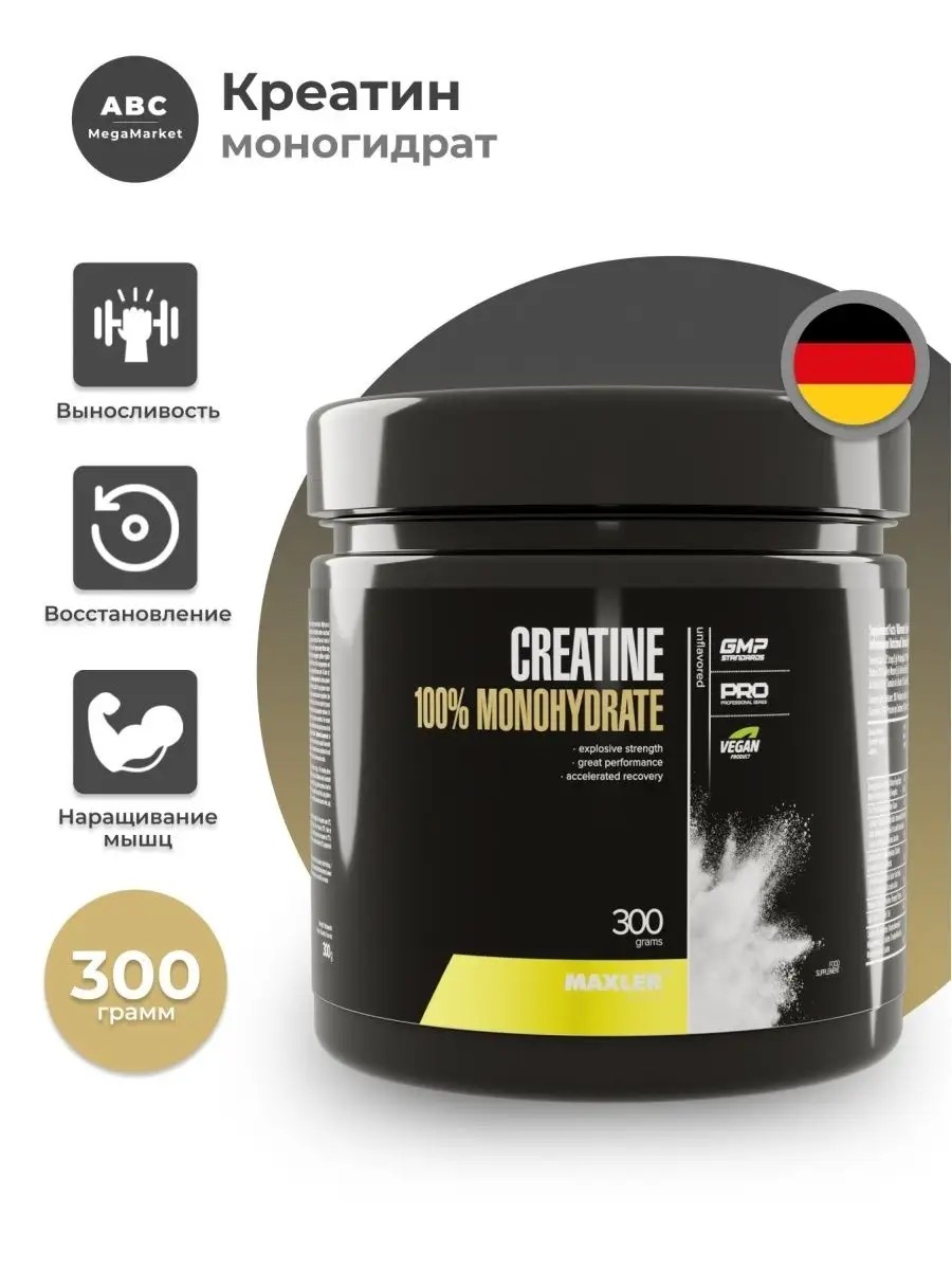 Creatine Monohydrate Maxler Creatine Monohydrate is a 100% creatine monohydrate powder from Maxler. Maxler creatine monohydrate has the highest active ingredient content and is the most common form of creatine. Creatine is designed to increase muscle mass, strength, and endurance, as well as improve the effectiveness of physical activity. The powder is tasteless and odorless, and stores well.