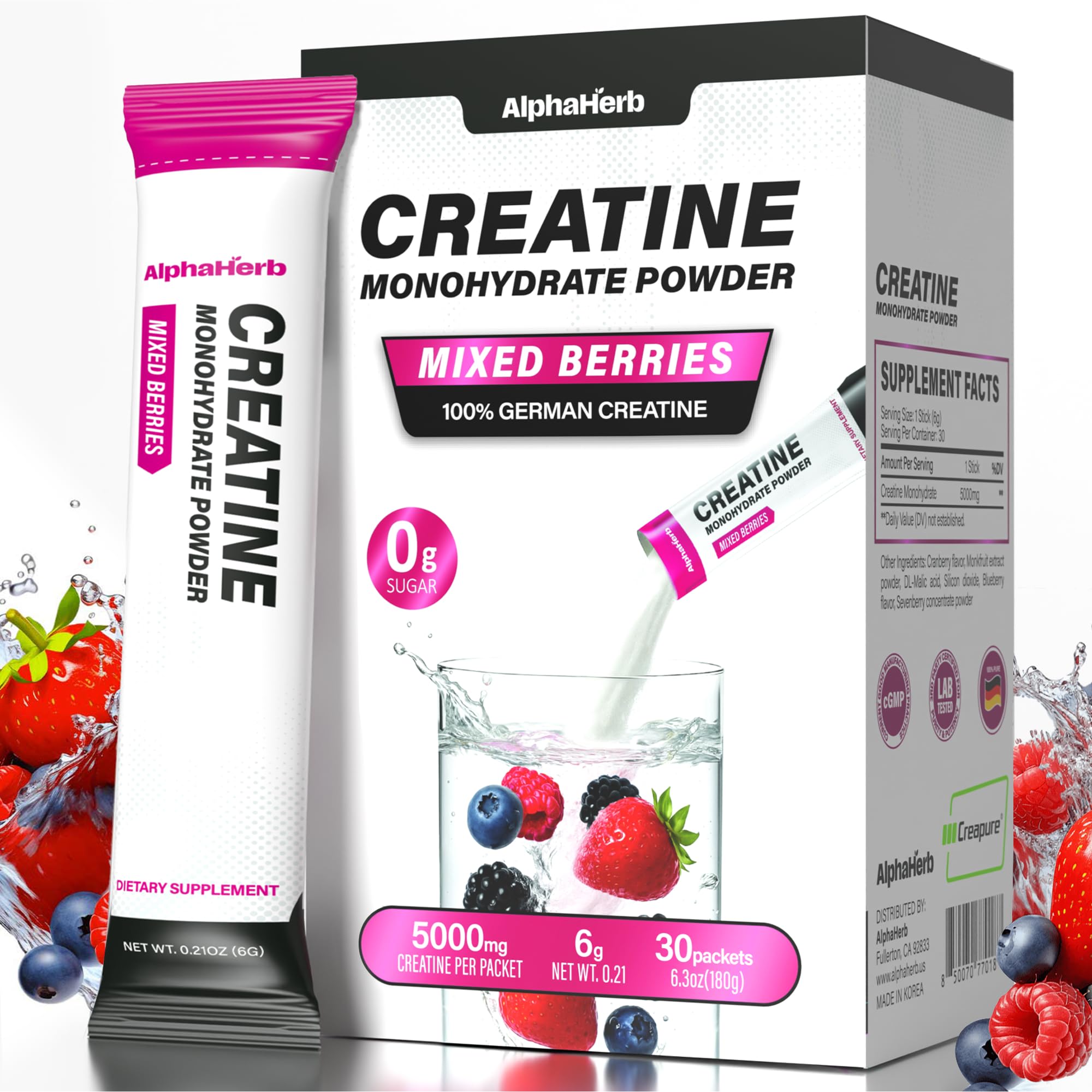 CLEAN FORMULA QUALITY STANDARDS: AlphaHerb creatine powder is made without fillers, soy, dairy, gluten, or unnecessary additives. Produced in a cGMP-certified facility under strict quality control measures, ensuring purity and consistency from pack to pack. REFRESHING MIXED BERRY FLAVOUR: Stay consistent with a drink you'll actually enjoy. Our Mixed Berry flavour creatine monohydrate blends smoothly into water and other beverages, with no added sugar, artificial flavours, or artificial sweeteners. READY-TO-MIX STICK PACKS: No scoops, no mess, no guesswork. AlphaHerb Creapure creatine comes in single-serve stick packs that fit easily into your pocket, gym bag, or desk drawer. Just tear open, mix with 8–12 oz of water or your favorite drink, and enjoy convenient use anytime, anywhere. SUPPORTS ENERGY PERFORMANCE: Creatine monohydrate is widely recognized for supporting energy during repeated bursts of effort in demanding activities. It helps you stay consistent in strength training, high-intensity exercise, or longer sessions. HIGH–PURITY GERMAN CREAPURE CREATINE: Each stick pack delivers a full 5000mg of German creatine monohydrate powder, one of the most researched and trusted ingredients for active individuals. Creatine supports the body's natural energy cycle, making it a smart choice for those with fitness routines or active lifestyles.
