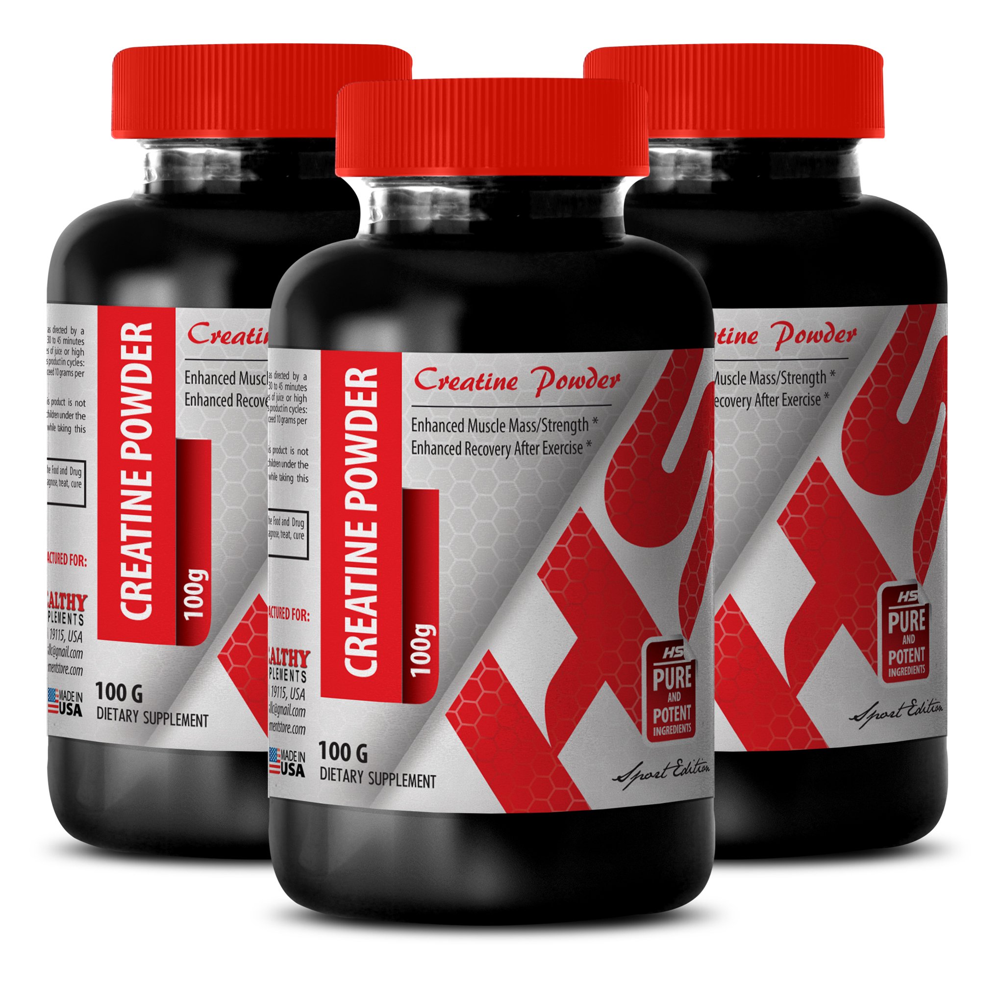 CREATINE POWDER - Each bottle - 100 MG - all natural Non-GMO, Gluten-Free formula to improve athletic performance and improve cognitive ability, increase energy levels, increase power and performance, improve muscle strength, build muscle mass and build lean mass. Made in USA. Scientifically standartirized to the highest level of our active principles. 30-day 100 money-back guaranteed. SUPPORT THE GROWTH OF MUSCLES: Our natural creatine monohydrate supplement may be beneficial for increg of muscle mass and promote the muscle volume. This organic creatine supplement may show its properties in increg muscle mass and strengthening the muscle strength. Our natural creatine supplement may increase overall maintenance of skeletal muscles as well as promoting overall athletic performance. INCREASE EXERCISE PERFORMANCE: This natural creatine monohydrate supplement may not only assist in weight loss but promote exercise performance and endurance thus show its exercise benefits. Due to this performance boosters ability this creatine powder supplement may increase energy. This natural creatine supplement by Healthy Supplements may be beneficial for boosting the athletic performance and increg exercise capacity. BENEFICIAL FOR TESTOSTERONE LEVELS: this natural creatine supplement may be useful for promoting the level of testosterone. By increg testosterone levels this herbal supplement may increase energy, mental activity. Obtainig numerous health benefits this supplement may support the training program, increased the level of testosterone and promote athletic performance. Creatine pills for men - CREATINE POWDER 100G - promote weight gain (3 Bottles): Our natural creatine powder supplement may be beneficial for energy support where it is demanded, helping athletes to increase their ability to produce energy, improving athletic performance. Our organic creatine monohydrate may show it properties in improving overall performance as well as improving cognitive ability.