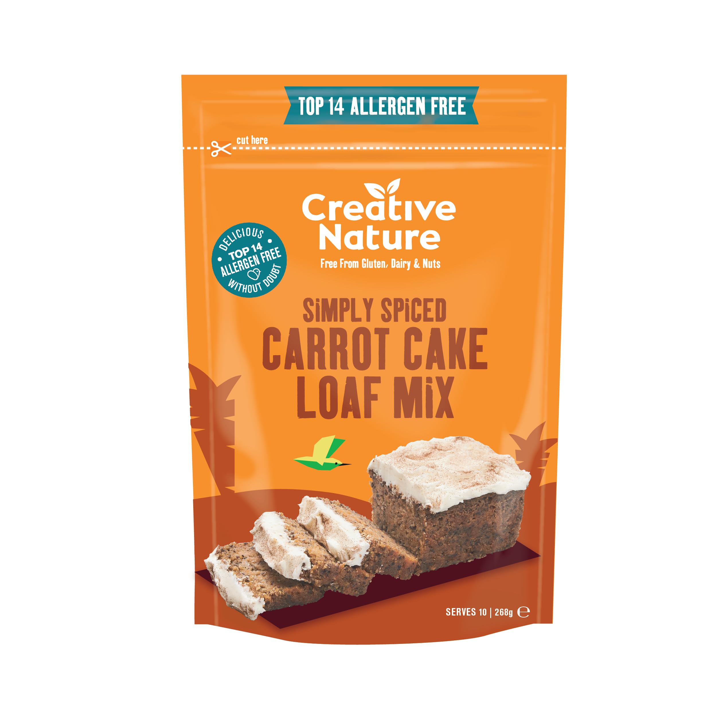 Simply spiced carrot cake loaf mix sumptuously-spiced gluten-free. This afternoon tea classic loaf has had the Creative Nature make-over, removing harmful allergens like walnuts to create a beautifully moist cake, Free From the 14 major allergens (including Gluten, Dairy, Nuts, Peanuts, Soya and Sesame). Enjoy this family favourite as a light slice, birthday cake or picnic treat, without risking a life-threatening allergic reaction! It's perfectly spiced, needs 3 simple ingredients to make, is completely suitable for vegans and has a yummy icing idea on the back of pack, meaning all the hard work is already done and the consumer can just sit back and indulge. It's definitely a keeper the charming cinnamon tinges will tickle your taste buds, and its moist sponge is perfect with a cuppa! Create your own carrot cupcakes, or even double-layer your cake. Make sure you're not missing out, and grab your carrot cake mix! INGREDIENTS Flour Blend (Brown Rice Flour, White Rice Flour, Maize Starch, Tapioca Starch, Maize Flour), Unrefined Cane Sugar, Milled Flaxseed, Baking Powder (Mono Calcium Phosphate, Corn Starch, Raising Agent: Sodium Bicarbonate), Mixed Spice (Cinnamon, Coriander, Ginger, Allspice, Nutmeg, Clove), Pink Himalayan Salt. DIRECTIONS JUST ADD • 165g Grated Carrot • 70ml Vegetable Oil • 65ml Cold Water • For a fluffier loaf, add 1tbsp Apple Cider Vinegar or fresh lemon juice HOW TO MAKE • Preheat oven to 180c 350f gas mark 4 • Rip open this packet like you mean it! Then lovingly pour into a mixing bowl. • Add the water and oil and blend together (sing your favourite song to pass the time, for bonus points try and change the lyrics to be about carrots) • Gently fold in the grated carrot (and a handful of raisins if you fancy) and let it rest for 2 mins. • Scoop the beautiful blend into a greased 1lb loaf tin and bake for 30-35mins • Graciously turn out the cake onto a cooling rack and do a celebratory jig before tackling the frosting. Try and keep busy for 30 minutes while the cake cools! FOR A FABULOUS FROSTING (not included in this packet) • 156g Powdered (Icing) Sugar • 60g Extra Virgin Coconut Oil • 30ml of your favourite milk • Splash of Vanilla Extract WHIP IT UP • Ensure coconut oil is room temp (nice and soft), then whisk it to a creamy texture in a bowl • Practice multi-tasking by gradually adding the sugar while mixing together slowly • Pop in the Vanilla, then slowly add the milk whilst mixing until you reach your desired consistency • Want a firmer frostingUse less milk • Want a runny frosting that drips down the sidesAdd a splash more milk! • Keep your finished, frosted masterpiece in the fridge and enjoy with a cup of tea SAFETY WARNING Be careful when removing from the oven as it will be hot! MANUFACTURER CONTACT INFORMATION 36 Central Avenue, West Molesey, Surrey, KT8 2QZ See moreNO MORE FOMO: At Creative Nature we know what it's like to miss out. If you have allergies or specific dietary requirements, indulge yourself in the purity and pleasure of Creative Nature. Give yourself the confidence to enjoy delicious treats, because everyone deserves a little taste adventure. ALL-NATURAL INGREDIENTS: This baking mix is made with the tastiest natural ingredients and free from refined sugar and sweeteners. A guilt-free treat that still tastes amazing. PERFECT FOR EVERYONE: All of our delicious baking mixes are completely free from the top 14 allergens, meaning they are safe for everyone to enjoy perfect for sharing!. FREE-FROM BAKING MADE EASY: This great-tasting baking mix is perfect for novice bakers and those who need a time-saving option without compromising on quality or flavour, or anyone seeking a simple, allergen-free baking mix!. CARROT CAKE MIX: Enjoy Creative Nature's sumptuously-spiced carrot cake loaf mix. Marvellously moist delicious, our carrot cake mix is created with the finest natural ingredients for a taste good, feel good bake.