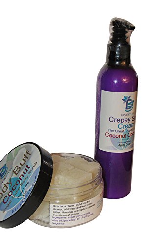 It is "The Great Crepe Escape" in a bottle. Smooth away waffled and crepey looking skin with our plumping and hydrating lotion. May be used on the face for spot treatments (like under the eyes) but do not apply all over the face if you are prone to acne. Great for the neck and decolletage too. Comes in an 8 ounce bottle. Diva Stuffs sugar cube scrubs are soft, non irritating and exfoliates dry, dead skin. In addition it heals and nourishes and your skin will feel soft and supple. Our sugar scrubs are made using the finest ingredients and do contain soap so it will lather. Take one or two cubes into the shower and moisten then work into a lather and massage over body, rinse clean. Follow with a with our Crepey Skin Cream for super soft, smooth and supple skin . This comes in 1, 8 ounce jar