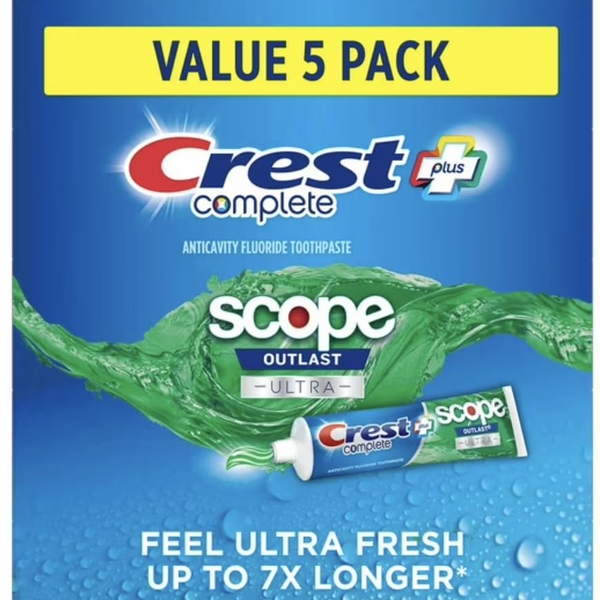 REFRESHING MINT FLAVOR: Features a crisp, invigorating mint taste that leaves your mouth feeling clean and refreshed after every brush. VALUE PACK: Includes 5 tubes of 6.3 oz. toothpaste each, providing excellent value and ensuring your family has a long-lasting supply for daily oral hygiene. MULTI-BENEFIT FORMULA: Fights cavities, whitens teeth by removing surface stains, strengthens enamel, and freshens breath in one powerful toothpaste. LONG-LASTING FRESHNESS: Infused with Scope technology that delivers extended breath freshness that outlasts ordinary toothpastes for hours of confidence. COMPLETE PROTECTION: Crests Complete Scope Outlast Ultra toothpaste provides comprehensive oral care with cavity protection, tartar control, and long-lasting fresh breath.