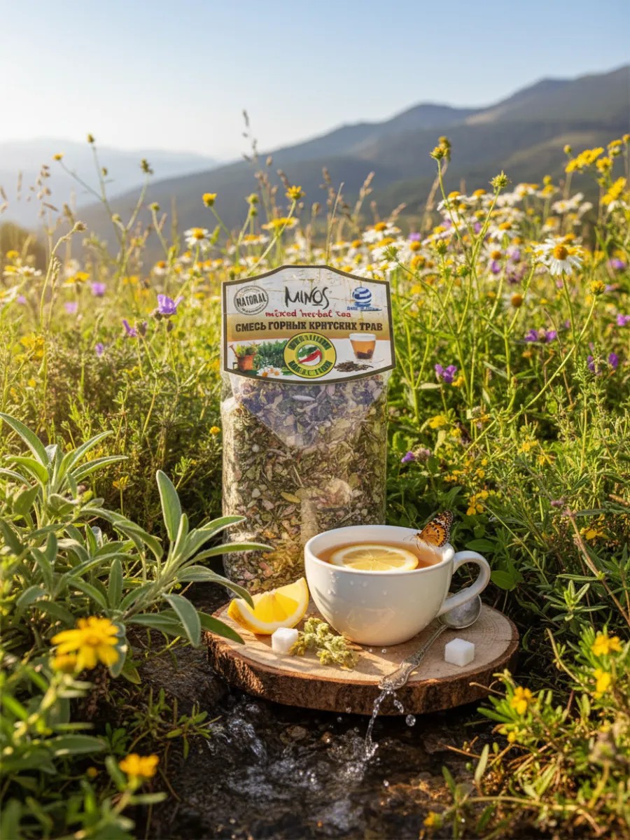 Критский травяной чай - имеет приятный вкус и аромат, собран в экологически чистых горах острова Крит в Греции, содержит полезные и микро и макро- элементы, тонизирует, бодрит, заряжает энергией. Процесс приготовления: 1 столовую ложку чая залить стаканом кипятка и настаивать 15 минут.