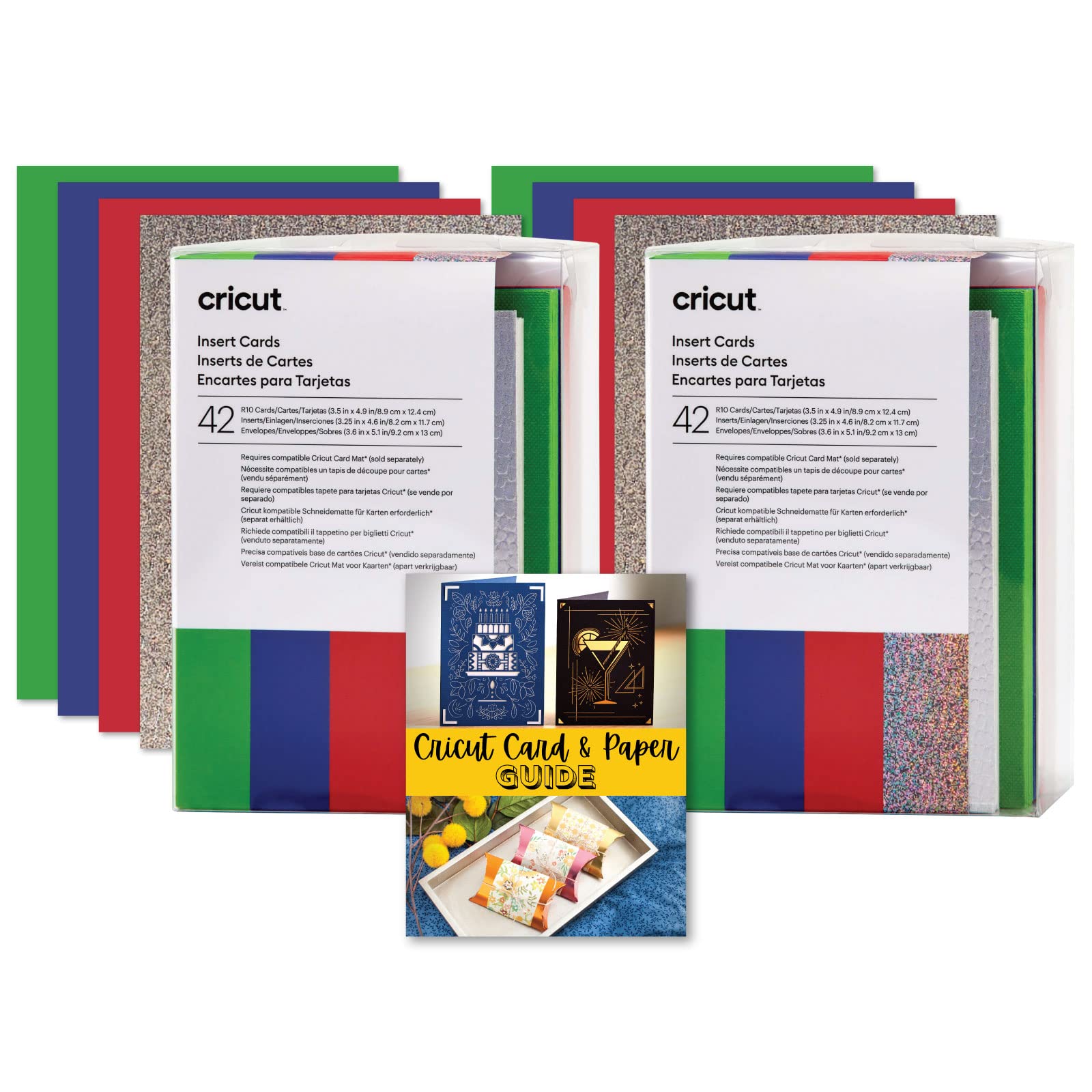 BUNDLE INCLUDES: 2 - 42 R10 Cards (3.5in x 4.9in) in Green, Blue, Red (14 of each color), 2- 42 Inserts (3.25 in x 4.6in) in Holographic Scales, 2- 42 White Envelopes (3.6in x 5.1in); 1- Card and Paper Digital Guide (print copy unavailable). DIMENSIONS: R10 Cards 3.5in x 4.9in (8.9cm x 12.4cm), Inserts 3.25in x 4.6in (8.2cm x 11.7cm), Envelopes 3.6in x 5.1in (9.2cm x 13cm). EASY TO USE: Create vibrant two-tone greeting cards without the mess or hassle of glue - For use with Cricut Joy, Cricut Explore, or Cricut Maker machines. ENDLESS POSSIBILITIES: Make incredible designs for any occasion such as birthdays, anniversaries, party invitations, Christmas cards, and much more. CRICUT INSERTS: Easy to cut designs with specialized Cricut Joy Card Mat or Cricut Mat (sold separately).