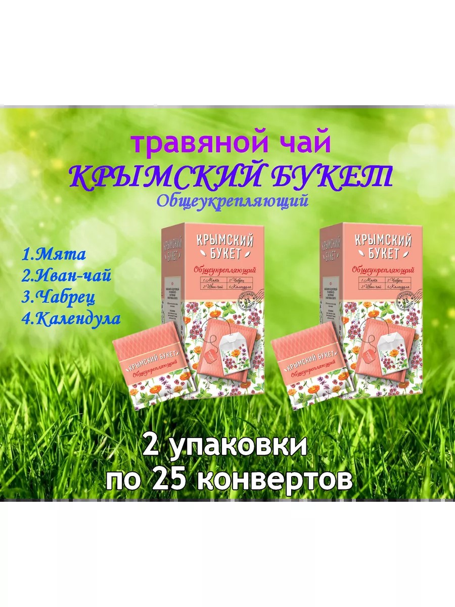 Чай Общеукрепляющий "Крымский букет" - это уникальный травяной чай, который станет прекрасным дополнением к вашему ежедневному ритуалу чаепития. В упаковке представлено 25 пакетиков по 1,5 грамма, а всего в наборе вы получаете 2 таких упаковки. Этот чайный сбор создан из тщательно отобранных крымских трав, что обеспечивает его натуральность и высокое качество.