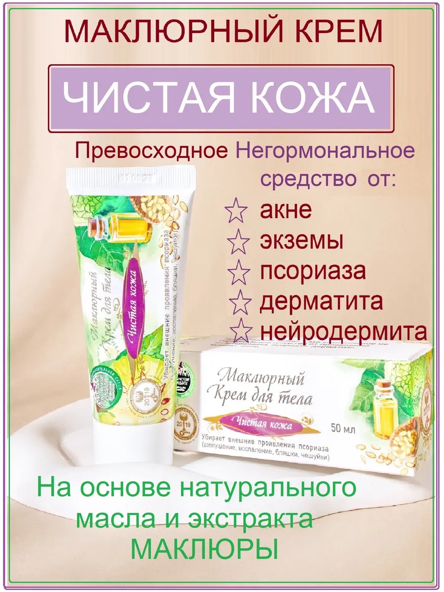Маклюрный крем для тела «Чистая кожа» это комплексное негормональное средство от проявлений нейродермита, псориаза, дерматита, экземы, акне. Создан на основе натурального масла и экстрактов маклюры, с добавлением масла Эму. При создании крема маклюрного использованы народные рецепты, проверенные временем, и собственные разработки. Рекомендуется как уникальное средство от нейродермита, псориаза, дерматита, экземы, акне