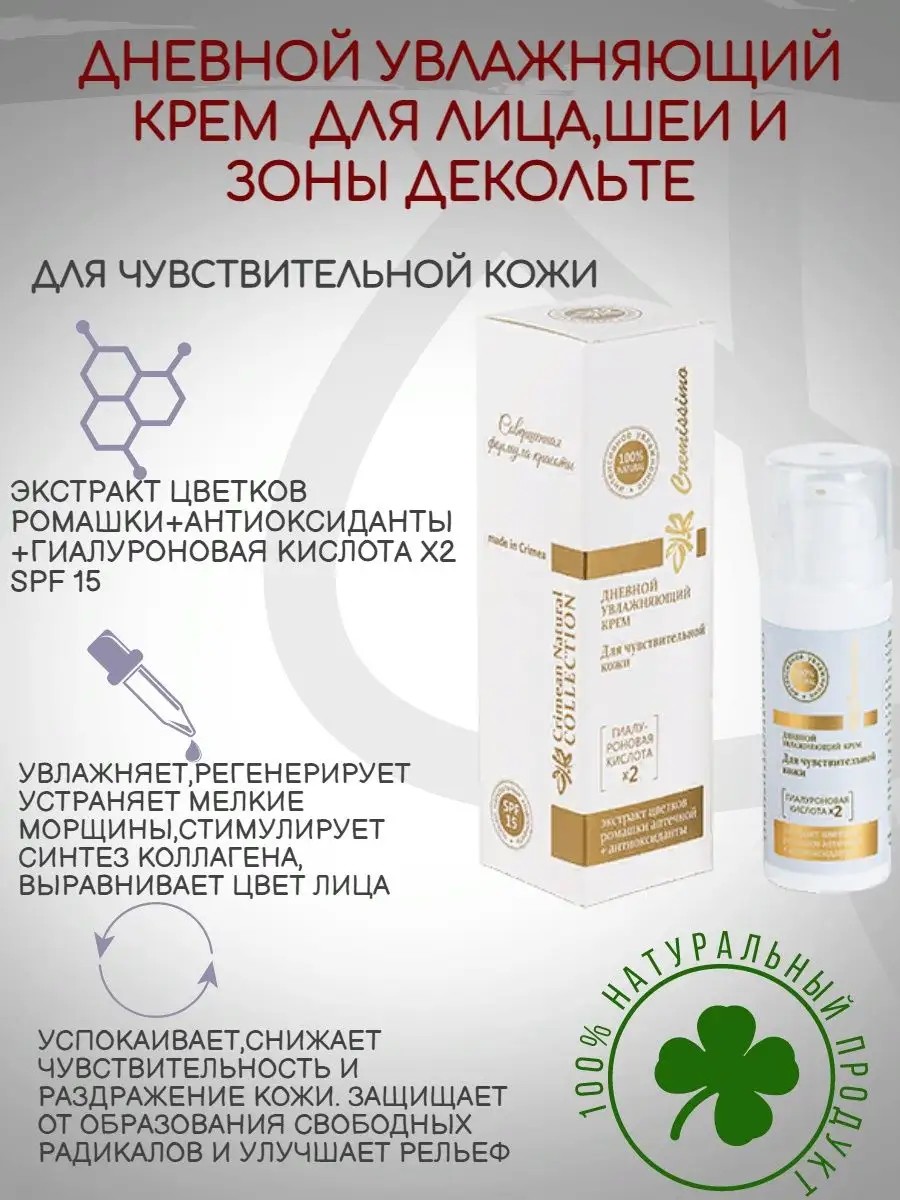 Крем натуральный для лица дневной увлажняющий подходит для всех типов кожи, особенно для чувствительной и кожи с куперозом. Крем успокаивает, защищает от образования свободных радикалов, устраняет мелкие морщины, увлажняет, стимулирует синтез коллагена. При регулярном использовании улучшается рельеф кожи, выравнивается цвет лица, снижается чувствительность и раздражительность кожи.ДЕЙСТВИЕ:увлажняет;успокаивает, снижает чувствительность и раздражительность кожи;устраняет мелкие морщины;регенерирует;улучшает рельеф кожи;выравнивает цвет лица;стимулирует синтез коллагена;защищает от образования свободных радикалов.ПРИМЕНЕНИЕ:Наносите на тщательно очищенную кожу лица, шеи, зону декольте и область вокруг глаз. Является превосходной основой для нанесения макияжа.УСЛОВИЯ ХРАНЕНИЯ: хранить в сухих, закрытых помещениях при температуре от +5°С до +25°С и относительной влажности воздуха не выше 75%, не допускать попадания прямых солнечных лучей. После вскрытия крем рекомендуется хранить не более 6 месяцев.ПРОТИВОПОКАЗАНИЯ: индивидуальная непереносимость составляющих