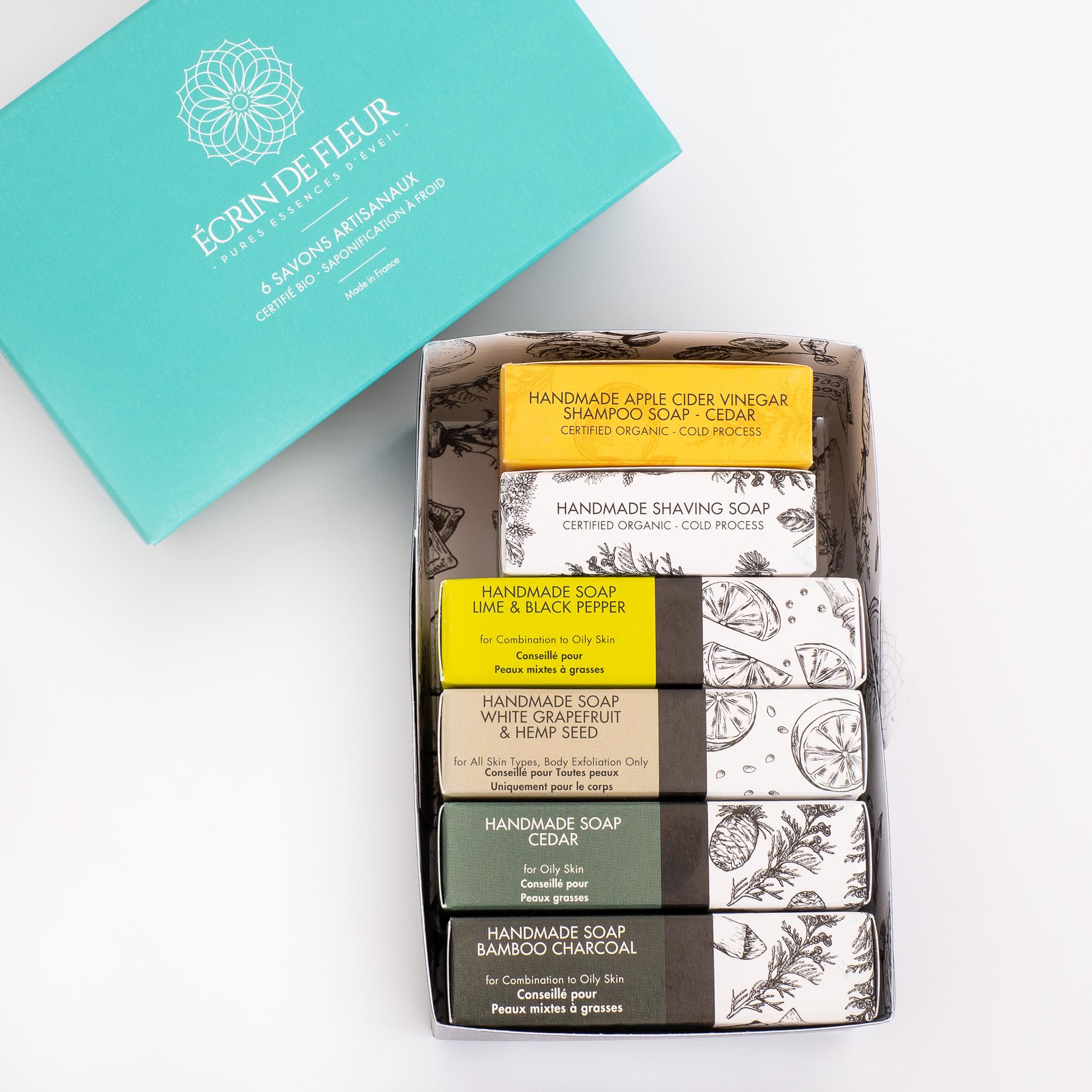 Discover our exclusive organic men's grooming set, featuring a range of solid soaps and shampoos for a natural and revitalizing grooming experience. Set contents: Cedar Soap (90g) Woody cedar scent, providing freshness and vitality. Benefits: Deep cleansing, soothing fragrance. Lime Black Pepper Soap (90g) Lime and black pepper essential oils, for a feeling of freshness. Benefits: Purifies the skin, balances sebum production, invigorating fragrance. Charcoal Cedar Soap (90g) Activated charcoal and cedar essential oil, ideal for detoxifying and deep cleansing. Benefits: Detoxifying, reduces excess sebum, soothing woody fragrance. White Grapefruit Hemp Seed Exfoliating Soap (90g) Hemp seeds and white grapefruit essential oil, perfect for exfoliating and revitalizing. Benefits: Natural exfoliation, soft and radiant skin, fresh and fruity fragrance. Solid Shampoo - Apple Cider Vinegar Cedar (90g) Apple cider vinegar and cedar essential oil for clean and balanced hair. Benefits: Gently cleanses, balances the scalp, fresh and woody fragrance. Cedar-Patchouli Soap (90g) Cedar and patchouli essential oils for soothing care. Benefits: Soothing, moisturizing, woody and spicy fragrance. Features: Suitable for all skin types, including sensitive skin. Each soap and shampoo weighs 90g. Made with natural and organic ingredients to care for your skin and the environment. Transform your grooming routine with our 6-pack Organic Men's Soap Set and give your skin and hair a luxurious and natural experience with every use. SAFETY WARNING Avoid contact with eyes. In case of contact, rinse with water.Handcrafted cold-process soap, made in France, 30 days of slow air drying, the benefits of organic ingredients are preserved in the soap.Écrin de Fleur – Savon Hommes Bio 6-pack (Savon Cèdre, Savon Citron Vert, Savon Charbon, Savon Exfoliant Pamplemousse, Shampooing Solide - Vinaigre Cidre - Cèdre, Savon Rasage Cèdre)DESCRIPTION DU PRODUIT DESCRIPTION DU PRODUIT Découvrez notre coffret exclusif de soins biologiques pour hommes, comprenant une gamme de savons et de shampooing solides pour une expérience de soin naturel et revitalisant. Contenu du coffret : Savon Cèdre (90g) Parfum boisé de cèdre, apportant fraîcheur et vitalité. Bienfaits : Nettoyage en profondeur, parfum apaisant. Savon Citron Vert Poivre Noir (90g) Huiles essentielles de citron vert et de poivre noir, pour une sensation de fraîcheur. Bienfaits : Purifie la peau, équilibre la production de sébum, parfum vivifiant. Savon Charbon Cèdre (90g) Charbon actif et huile essentielle de cèdre, idéal pour détoxifier et nettoyer en profondeur. Bienfaits : Détoxification, réduction de l'excès de sébum, parfum boisé apaisant. Savon Exfoliant Pamplemousse Blanc Graines de Chanvre (90g) Graines de chanvre et huile essentielle de pamplemousse blanc, parfait pour exfolier et revitaliser. Bienfaits : Exfoliation naturelle, peau douce et éclatante, parfum fruité et frais. Shampooing Solide - Vinaigre de Cidre Cèdre (90g) Vinaigre de cidre et huile essentielle de cèdre, pour des cheveux propres et équilibrés. Bienfaits : Nettoie en douceur, équilibre le cuir chevelu, parfum frais et boisé. Savon Cèdre-Patchouli (90g) Huiles essentielles de cèdre et de patchouli, pour un soin apaisant. Bienfaits : Apaisant, hydratant, parfum boisé et épicé. Caractéristiques : Adapté à tous les types de peau, y compris les peaux sensibles. Chaque savon et shampooing pèse 90g. Fabriqué avec des ingrédients naturels et biologiques pour prendre soin de votre peau et de l'environnement. Transformez votre routine de soins avec notre coffret Savon Hommes Bio 6-pack, et offrez à votre peau et vos cheveux une expérience luxueuse et naturelle à chaque utilisation. AVERTISSEMENT DE SÉCURITÉ Éviter le contact avec les yeux. En cas de contact, rincer à l'eau.Savon artisanal saponifié à froid, fabriqué en France, 30 jours de séchage lent à l'air, les bienfaits des ingrédients biologiques sont préservés dans le savon.