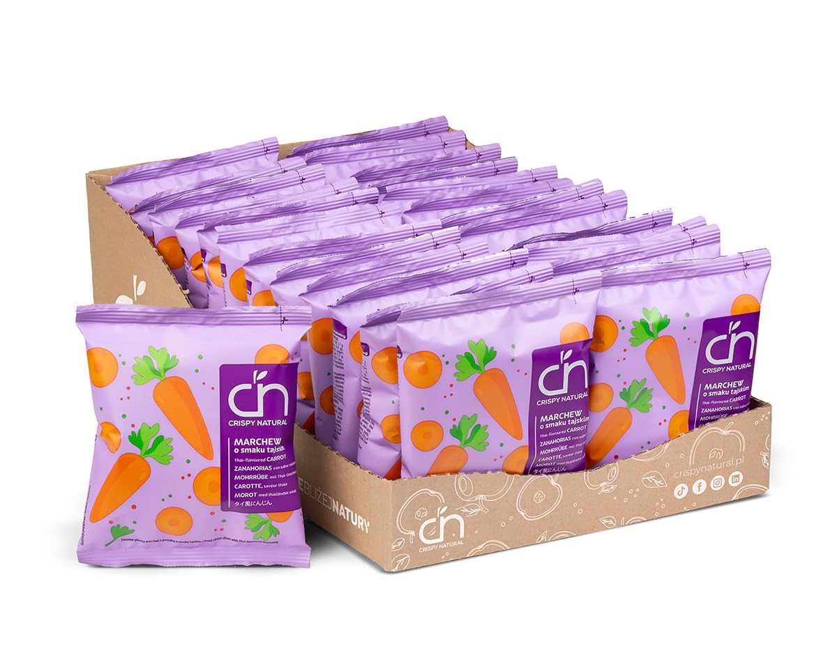 Crispy Natural Chips de Carottes Saveur Thaïlandaise 24x18g. Casse-croûte Naturel Sans Sucre. Emballages Pratiques.