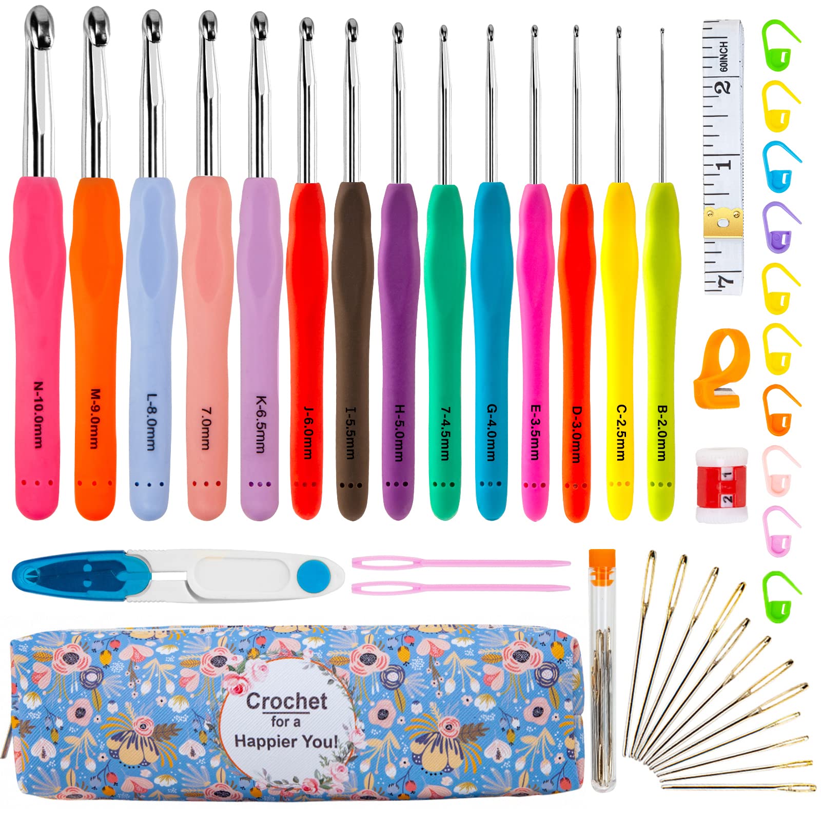 ?Easy to Carry?With the portable storage bag, convenient to store and carry the crochet hooks and knitting accessories, and never lose anything again. Easily put it in your backpack, luggage, or suitcase. Ideal for taking it everywhere you want to go. ?A Great Gift for Crochet? If you want to give a crochet hook set gift, it's a good choice. Great crochet hooks ergonomic kit for crocheter, Great gift idea for Christmas, mother's day, birthday, and any occasion. ?Very useful knitting accessories?These are the accessories that knitter enthusiasts really need, and their practicality is affirmed by enthusiasts: 10pcs stitch markers, 12pcs large eye blunt needles, 2pcs sewing needles plastic, 1pcs measure tape, 1pcs row counter, 1pcs ring cutter, 1pcs scissor, 1pcs crochet hook case. This is a useful crochet kit. ?Full-Size Crochet Hooks Set?This ergonomic crochet hook set includes 14pcs assorted rubber handle crochet needle. 14 US standard size from B(2mm) to N(10mm). Full size for your crocheting needs (no additional purchases required). ?Crochet Hooks with Ergonomic Soft Grip?Arthritis hands don't need to worry. The crochet hook has a soft and comfortable rubber handle that does not cause pain or cramp in the hands, wrists, or fingers, without discomfort even when used for a long time.