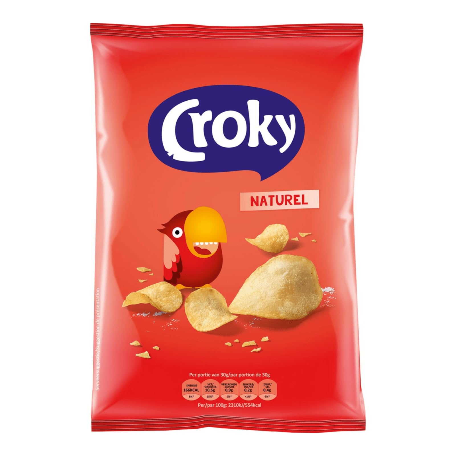 Sometimes you don't have to look far: a chip that's cut just a little bit thicker, a deliciously full potato flavor, and a hint of salt. Ta-da! Croky Naturel is the classic of classics. The classic, gluten-free, vegan. Contents per box: 20 x 40 grams. INGREDIENTS Small sachets of natural chips 20 x 40 g - Carton by Croky. Ingredients: potato chips (EU), turnip oil, 1.2 salt. energie kcal: 211.00 kcal - Energie en kJ: 2205.00 kJ - Graisses: 30.60 g dont acides gras saturés: 2.50 g - Glucides: 54.50 g dont sucre: 0.50 g - Fibres: 4.10 g - Protéines: 6.10 g - Sel: 1.20. g Croky consommateur service BE-7700 Mouscron, Belgique