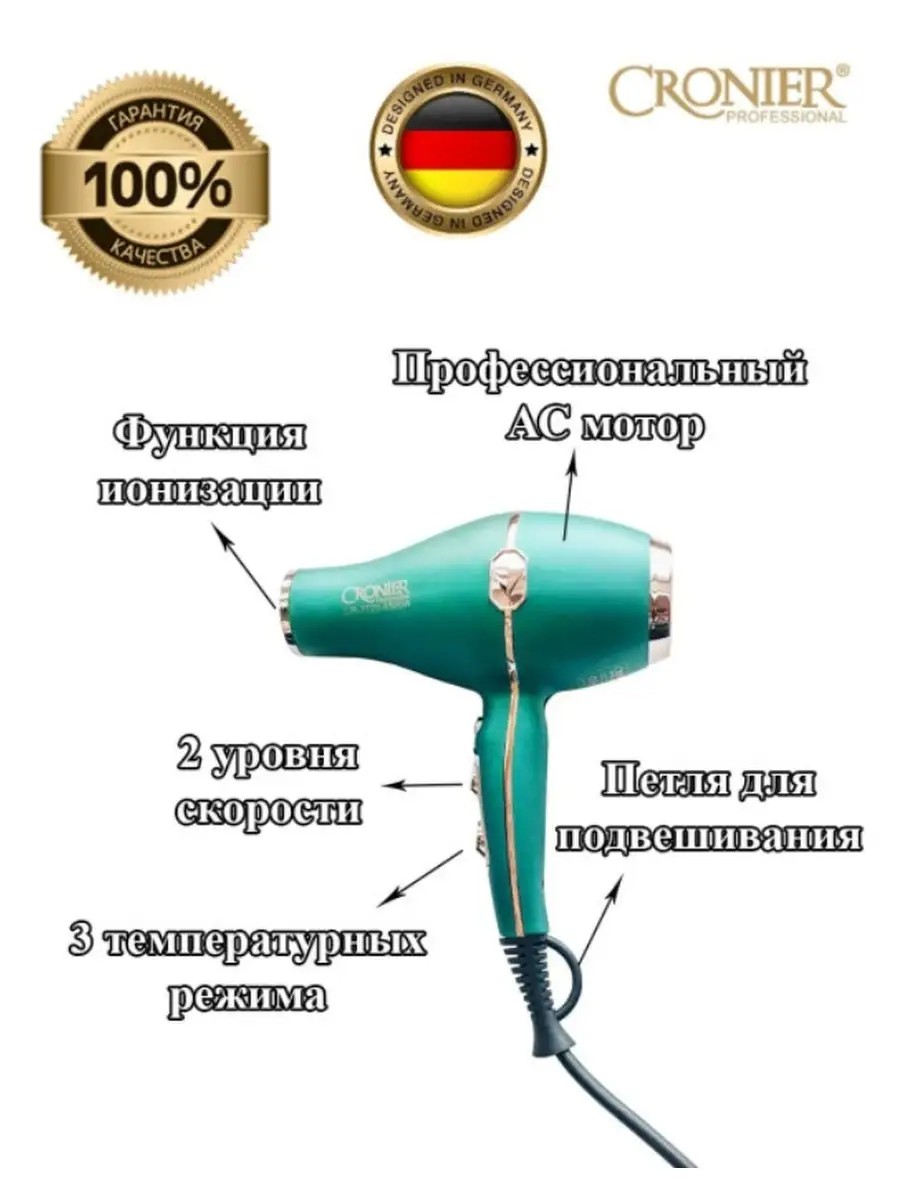 Профессиональный Фен для сушки и укладки волос Cronier Professional CR-7722 является модным и практичным бьюти-девайсом. В данной модели предусмотрена функция ионизации волос. Электрический прибор отличается высокой мощностью и позволяет высушить волосы в кратчайшие сроки - с ним вы не опоздаете на встречу. В комплекте с феном идет насадка-концентратор, которая подает направленный поток воздуха для создания стайлинга и формирования укладки волос. После завершения преображения воспользуйтесь режимом холодного воздуха, чтобы зафиксировать прическу. Удобный и долговечный фен Cronier CR-7722 рассчитан производителем на профессиональную работу в салоне красоты, что позволяет использовать его каждый день без всяких опасений. Можно выбрать один из 2 температурных режимов, также имеется 2 варианта скорости подачи воздуха. Для фиксации готовой укладки на корпусе предусмотрена кнопка подачи холодного воздуха.