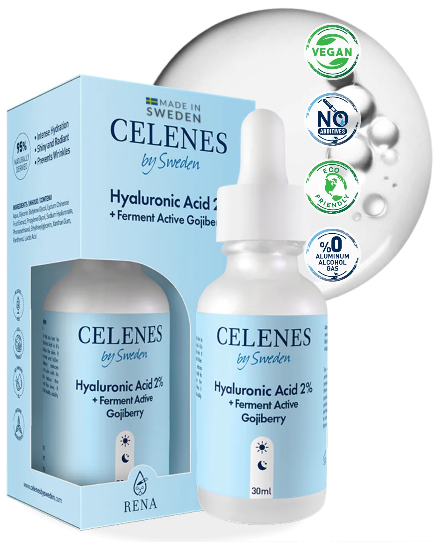 Easy and effective daily use: This serum is easy to integrate into your daily skin care routine. Apply a few drops to clean, dry skin every morning and evening. Warm the serum between your fingers and gently massage it into the face and neck until completely absorbed. The light texture makes it comfortable for use all year round and provides a perfect base for make-up or other skin care products. Safe for Sensitive Skin: Formulated without alcohol, fragrances or parabens, our serum is designed to deliver powerful results without causing irritation. It is formulated to be gentle enough for the most sensitive skin types, so everyone, regardless of skin sensitivity, can enjoy the rejuvenating benefits of our premium skin care without worry. Powerful Anti-Aging Properties: This serum effectively targets the visible signs of aging by reducing the appearance of fine lines and wrinkles. The combination of Hyaluronic Acid and Fermented Goji Berry work synergistically to firm the skin and smooth imperfections, providing a youthful appearance and restoring the skin to its youthful, pre-aged state. Enhanced Radiance and Vitality: Harnessing the power of Actively Fermented Goji Berry, known for its superior antioxidant properties, this serum not only protects the skin from environmental aggressors, but also brightens the complexion. It revitalizes the appearance of your skin, making it glowing and vibrant. Regular application can transform dull, tired skin into a more radiant and energetic complexion. Intensive Hydration: With a high concentration of 2 Hyaluronic Acid, this serum dives deep into the skin layers to lock in moisture, dramatically improving hydration and skin plumpness. Over time, it restores the skin's natural barrier, reduces the appearance of age-related sagging and promotes a smoother, more resilient texture. Ideal for revitalizing dehydrated and sagging skin, providing a supple, hydrated complexion day after day.Celenes by Sweden - Hyaluronzuur Serum 2 met Actief Gefermenteerde Goji Bes Hydratatie Antioxidant Alcoholvrij, Geurvrij, Parabeenvrij, 30mlGemakkelijk en effectief dagelijks gebruik: Dit serum is eenvoudig te integreren in je dagelijkse huidverzorgingsroutine. Breng elke ochtend en avond een paar druppels aan op een schone, droge huid. Warm het serum tussen je vingers op en masseer het zachtjes in het gezicht en de hals tot het volledig is opgenomen. De lichte textuur maakt het comfortabel voor gebruik het hele jaar door en biedt een perfecte basis voor make-up of andere huidverzorgingsproducten. Veilig voor gevoelige huid: Geformuleerd zonder alcohol, geurstoffen of parabenen, is ons serum ontworpen om krachtige resultaten te leveren zonder irritatie te veroorzaken. Het is zo samengesteld dat het zacht genoeg is voor de meest gevoelige huidtypes, zodat iedereen, ongeacht huidgevoeligheid, kan genieten van de verjongende voordelen van onze premium huidverzorging zonder zorgen. Krachtige anti-verouderingseigenschappen: Dit serum pakt effectief de zichtbare tekenen van veroudering aan door het uiterlijk van fijne lijntjes en rimpels te verminderen. De combinatie van Hyaluronzuur en Gefermenteerde Goji Bes werkt synergetisch om de huid te verstevigen en onvolkomenheden glad te strijken, biedt een jeugdige uitstraling en herstelt de huid naar haar jeugdige, vooraf verouderde staat. Verbeterde uitstraling en vitaliteit: Door gebruik te maken van de kracht van Actief Gefermenteerde Goji Bes, bekend om zijn superieure antioxidante eigenschappen, beschermt dit serum niet alleen de huid tegen omgevingsagressoren, maar verheldert ook de teint. Het revitaliseert de uitstraling van je huid, waardoor deze glanzend en levendig wordt. Regelmatige toepassing kan doffe, vermoeide huid transformeren in een meer stralende en energieke teint. Intensieve hydratatie: Met een hoge concentratie van 2 Hyaluronzuur duikt dit serum diep in de huidlagen om vocht vast te houden, wat de hydratatie en huidplumpheid drastisch verbetert. Het herstelt op den duur de natuurlijke barrière van de huid, vermindert de zichtbaarheid van leeftijdsgebonden verslapping en bevordert een gladdere, meer veerkrachtige textuur. Ideaal voor het revitaliseren van uitgedroogde en verslapte huid, zorgt voor een soepele, gehydrateerde teint dag na dag.