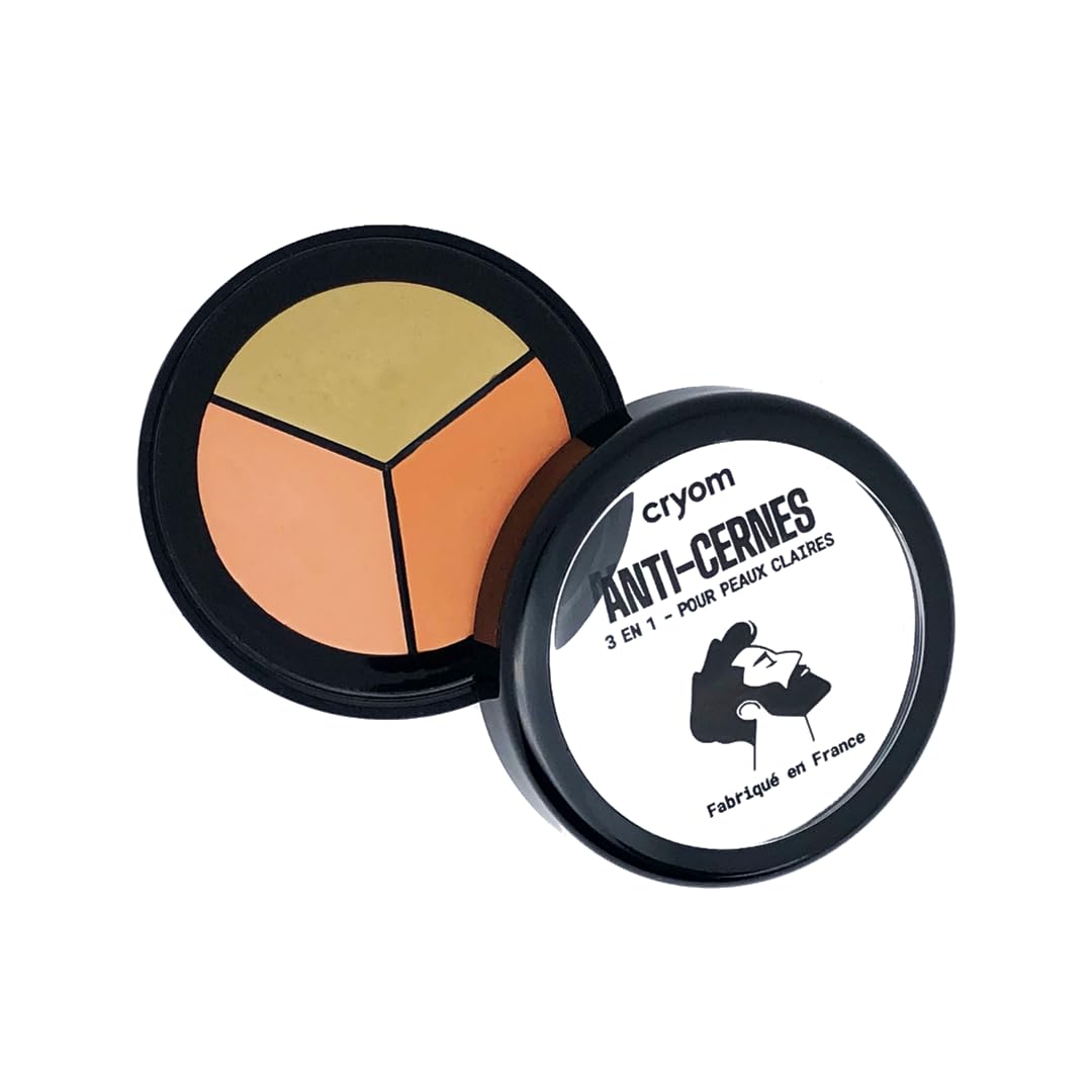 DESCRIPTION DU PRODUIT L'anti-cernes 3 en 1 cryom est une cire très pratique et complète pour corriger les cernes marqués et le regard fatigué. Sa formulation à base de cire veloutée waterproof à fort taux de pigments correcteurs ( 30 ). Texture mate grâce à une combinaison subtile de poudres compactes de fard ultra fines, de pigments et d'huiles. 2 versions disponibles : pour peaux claires ou peaux mates. 3 couleurs par boite. Chacune a son utilité ! Fabriqué en France. 84 d'ingrédients d'origine naturelle.