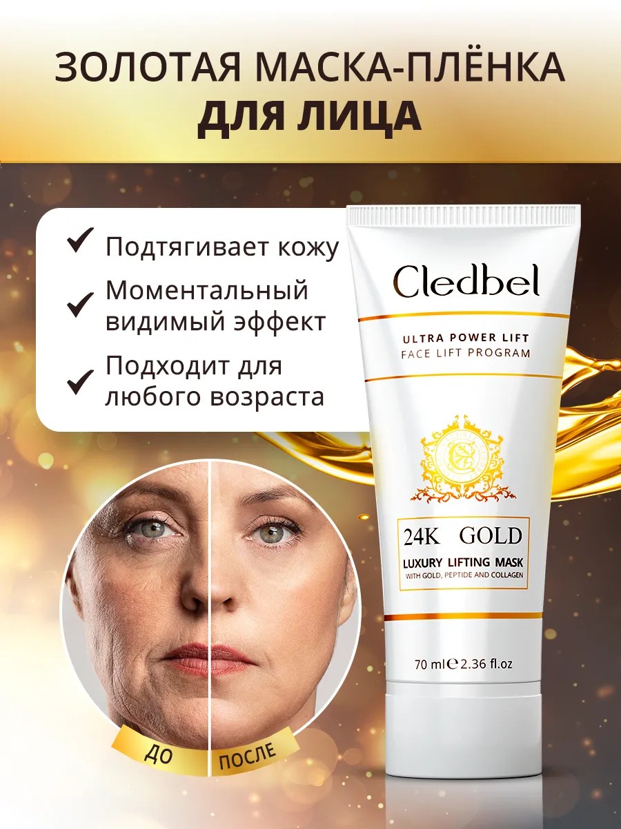 The CledBel Gold Mask is a facelift and essential daily skin care routine. Collagen and elastic fibers are responsible for skin elasticity. With age, collagen production declines, and elastic fibers disintegrate. This leads to wrinkles and sagging skin. The Gold Mask saturates the skin with collagen and effectively combats wrinkles on the face and neck. It is also an effective remedy for keeping your pores clear. Regular use significantly increases the effect, and your face will be clean and radiant! Directions: Apply a thin layer of the mask to cleansed skin. Leave on for 20 minutes (to form a film). Remove the resulting film from the chin to the forehead. For best results, it is recommended to use in combination with products before (to cleanse the skin) and after (to firm and soothe). The face mask acts as a film (a film mask, or a film mask).