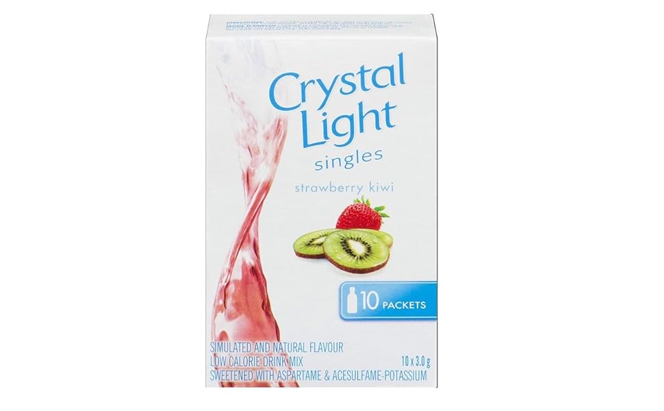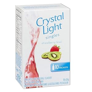 Crystal Light Strawberry Kiwi Pitcher Packs are a delicious, low-calorie powdered drink mix. Just pour the contents of one packet into 500 mL bottle or glass of cold water, shake or stir well and enjoy Crystal Light Strawberry Kiwi is made with natural flavours and has only 10 calories per packet, so you can feel good drinking it. Free from gluten, caffeine and sugar.