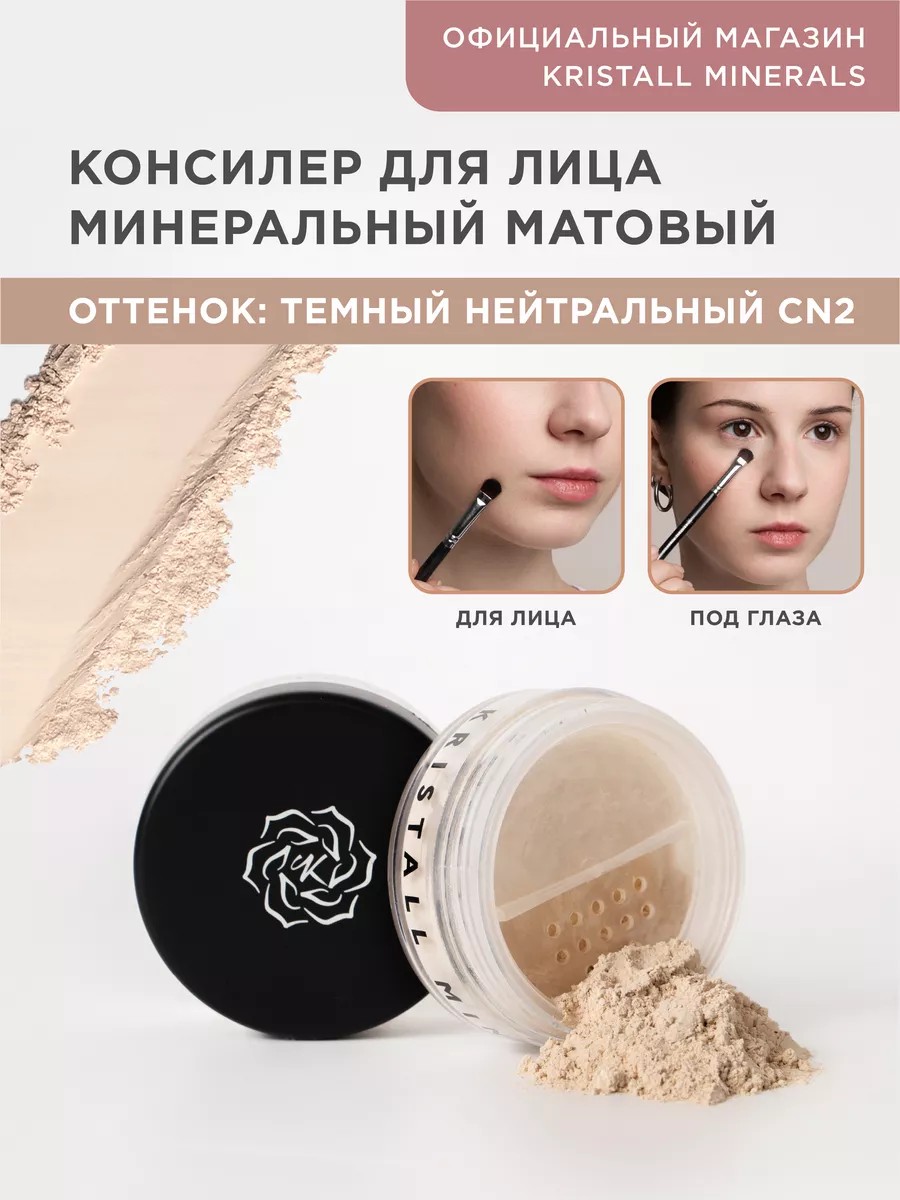 A bestseller! Experience an instant transformation with Kristall Minerals loose mineral concealer. This face and eye concealer feels comfortable and won't clog pores. Its dense coverage effectively conceals imperfections, redness, dark circles, and post-acne marks. Thanks to its ultra-fine milling, this face concealer has a silky texture and spreads easily without creasing. Choose a shade slightly lighter than your foundation for a more harmonious look. This mineral powder is ideal for everyday makeup; it feels comfortable on the skin, looks natural, and won't stain clothing. The natural, hypoallergenic formula of Kristall Minerals cosmetics is suitable for combination, oily, problematic, normal, and sensitive skin. For application, use a flat synthetic brush of a convenient size, such as the E04.