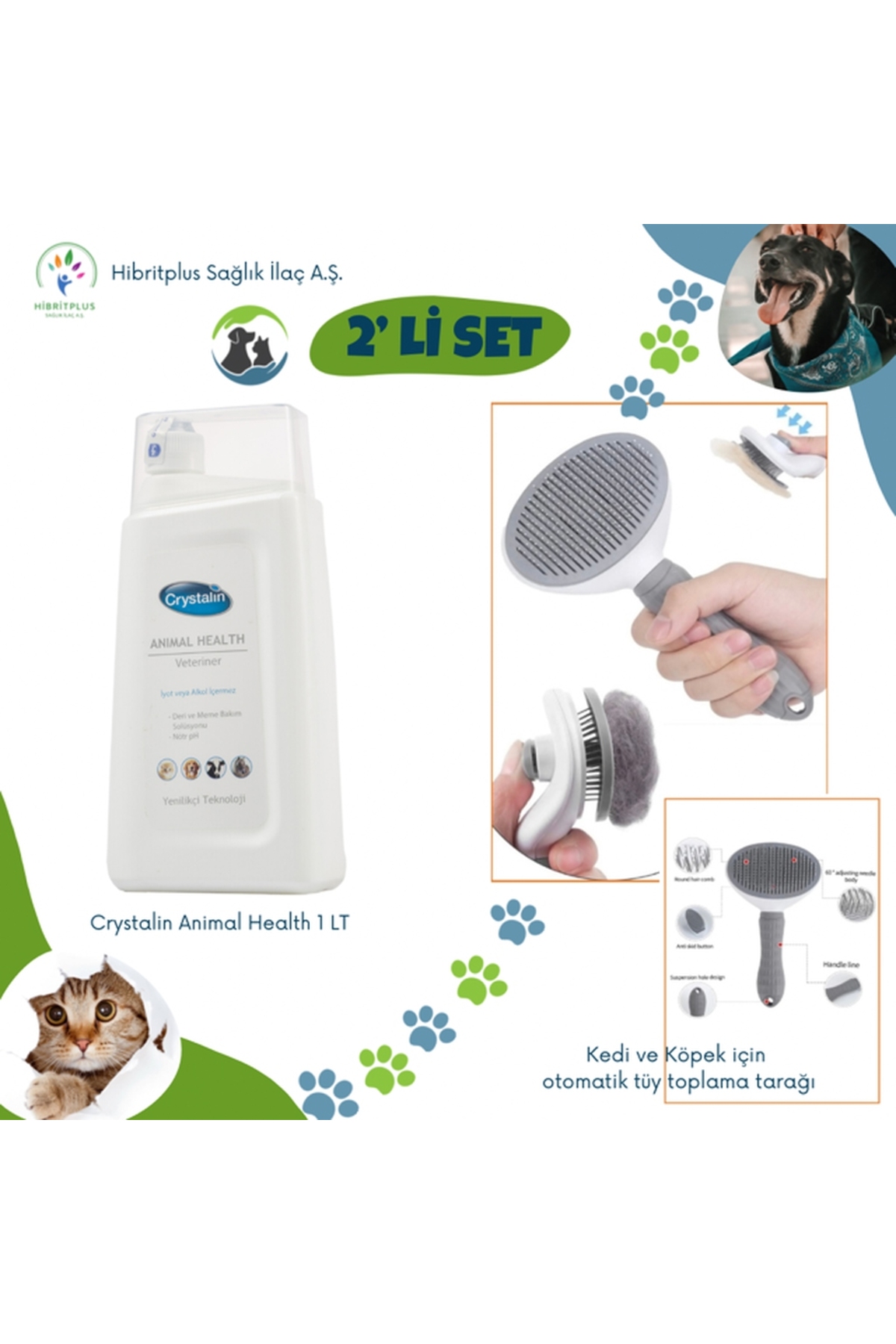 Crystalin Animal Health 1 Liter + Cat and Dog automatic hair collection comb set of 2