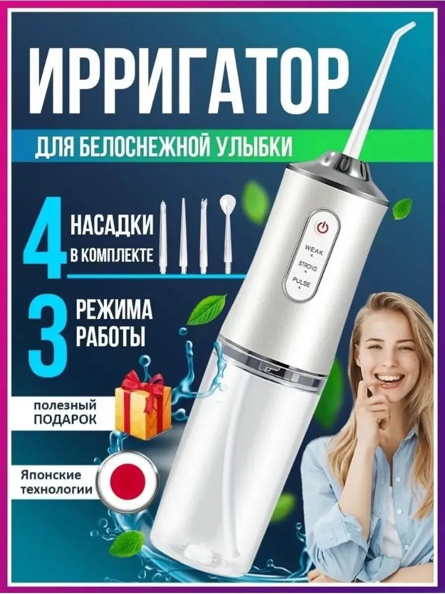Ирригатор для зубов - это универсальное устройство для ежедневного ухода, поддержания чистоты, красоты и здоровья полости рта и зубов, которое удобно взять с собой. Он позволяет не только очищать зубы от налета и пищевых остатков, но и улучшать кровообращение в деснах, что положительно сказывается на их здоровье. Кроме того, устройство оснащено различными насадками, которые значительно расширяют его функционал. В наборе 4 многофункциональные сменные насадки: стандартная для промывки полости рта, пародонтологическая, ортодонтическая, насадка для чистки языка. Насадки вращаются на 360 градусов. Съемная емкость - резервуар для воды имеет большой объем 220 мл. Устройство предусматривает 3 режима подачи воды - мягкий, интенсивный и пульсирующий поток. Благодаря водонепроницаемому пластиковому корпусу эту модель можно использовать даже в душе. Ортодонтический ирригатор подходит для удаления налета, зубного камня, частичек и остатков пищи, обеспечивает мягкий массаж десен, тщательно и бережно очищает межзубные карманы. Максимальная степень очистки достигается в комплексе с зубной щеткой. Такой массажный и очищающий прибор идеально подходит для лучшего ухода за брекетами, зубными протезами, коронками и имплантами. Отдельная насадка для чистки поверхности языка обеспечивает его качественную гигиену. Ирригатор подходит для очистки даже чувствительных зубов, не травмирует десны и избавляет их от кровоточивости. Однако ирригаторы не только делают зубы более красивыми и здоровыми, но и помогают избавиться от неприятного запаха изо рта, способствует повышению тонуса десен и улучшению кровообращения в них. Таким образом, можно с уверенностью сказать, что ирригаторы являются необходимым инструментом для тех, кто заботится о здоровье своих зубов и полости рта в целом. Три режима мощности позволяют подобрать комфортную силу напора струи даже для чувствительных зубов. Это полезный прибор для профессиональной очистки зубов и поддержания гигиены полости рта в домашних условиях. Для вас особенно важным пунктом является портативность устройства? Наш портативный стационарный ирригатор также имеет систему перезарядки по USB-порту, что делает его еще более удобным в использовании. Устройство оснащено индикатором с подсветкой для удобства использования в темное время суток. Ирригатор имеет водонепроницаемое покрытие, которое позволяет безопасно использовать его даже в душе и в ванной. Компактный переносной аппарат не займет много места в вашей дорожной сумке и вы сможете взять его с собой в поездку или воспользоваться им в походных условиях. Благодаря компактному, портативному, переносному формату прибор удобно брать с собой в поездку, на дачу, отдых, за город, в отпуск или путешествие. Он даже дома не займет много места - для его хранения достаточно небольшого пространства в шкафчике в ванной или на полке. Аккумулятор можно заряжать через провод от сети или от портативного блока питания. Одной полной зарядки хватит на 30 дней ежедневной работы. Ирригатор станет отличным подарком на 8 марта, 14 февраля, 23 февраля, Новый год и другие праздники. Не упустите шанс попробовать качественный и инновационный ирригатор портативный для рта и зубов по доступной цене, приобретайте устройство и наслаждайтесь моментом чистоты и свежести полости рта