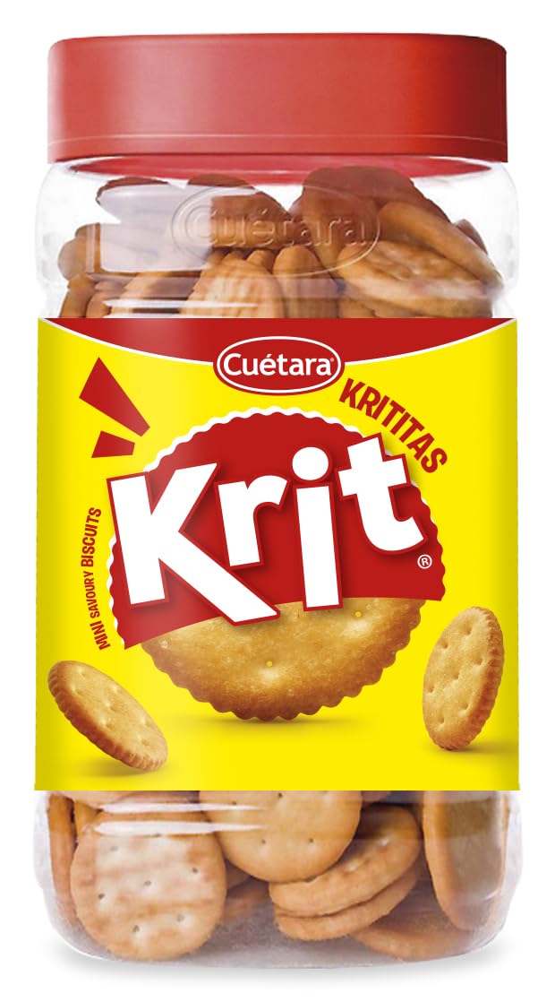 Cuétara Krit Krititas savory biscuits are baked with a soft yet crispy texture. They have a slightly salty taste and are perfect for snacking or sandwiches. They come in convenient packaging that helps maintain freshness for longer. INGREDIENTS Ingredients: Wheat flour, vegetable oils (palm, high oleic sunflower), sugar, glucose-fructose syrup, barley malt extract, salt, raising agents (ammonium and sodium carbonates), acidity regulator (calcium phosphate), yeast, flour treatment agent (sodium metabisulfite). May contain sesame, milk, soy, and eggs. Ingredients: Wheat flour, vegetable oils (palm, high oleic sunflower), sugar, glucose-fructose syrup, barley malt extract, salt, raising agents (ammonium and sodium carbonates), acidity regulator (calcium phosphate), yeast, flour treatment agent (sodium metabisulfite). May contain sesame, milk, soy, and eggs. Ingredients: Wheat flour, vegetable oils (palm, high oleic sunflower), sugar, glucose-fructose syrup, barley malt extract, salt, raising agents (ammonium and sodium carbonates), acidity regulator (calcium phosphates), yeast, flour treatment agent (sodium metabisulfite). May contain sesame, milk, soy, and eggs.Cuétara Krit Krititas Biscuits d'apéritif 350 gDESCRIPTION DU PRODUIT DESCRIPTION DU PRODUIT Les biscuits d'apéritif krit krititas de Cuétara sont un produit cuit avec une texture douce mais croustillante en même temps. Il a un goût légèrement salé et convient pour goûter ou sandwich. Ils sont livrés dans un emballage pratique qui aide à conserver la fraîcheur plus longtemps. INGRÉDIENTS Ingrédients : farine de blé, huiles végétales (palme, tournesol haute oléique), sucre, sirop de glucose et fructose, extrait de malt d'orge, sel, gazéfiants (carbonates d'ammonium et de sodium), correcteur d'acidité (phosphate de calcium), levure, agent de traitement de la farine (métatabysulfite de sodium). Peut contenir du sésame, du lait, du soja, des œufs. Ingrédients : Farinha de blé, huiles végétais (palme, girassol haut oléique), sucre, xarope de glycose et frutose, extrait de malt de cerf, sel, levedants (carbonates d'ammonium et de sodium), régulateur d'acidité (phosphate de calcium), levdure, agent de traitement da farinha (METABISSUL. FIFIFIFIFIFIFIo) Échelle comptage sésame, lecture, soja, ovos. Ingrédients : WHEAT flour, vegettable oils (palm, high oleic sunflower), sugar, glucose-fructose syrup, BARLEY malt extract, salt, raising agents (ammonium and sodium carbonates), acidity regulator (calcium phosphate), yeast, flour treatment agent (sodium METABISULPHITE). May contain SESAME, MILK, SOYA, EGGS. Ingrédients : Farine de BLÉ, huiles végétales (palme, tournesol haut oléique), sucre, sirop de glucose et fructose, extrait de malt d'ORGE, sel, poudres à lever (carbonates d'ammonium et sodium), correcteur d'acidité (phosphates de calcium), levure, agent de traitement de la farine (disulfite de sodium). Peut contenir Sésame, Lait, Soja, OEUFS.