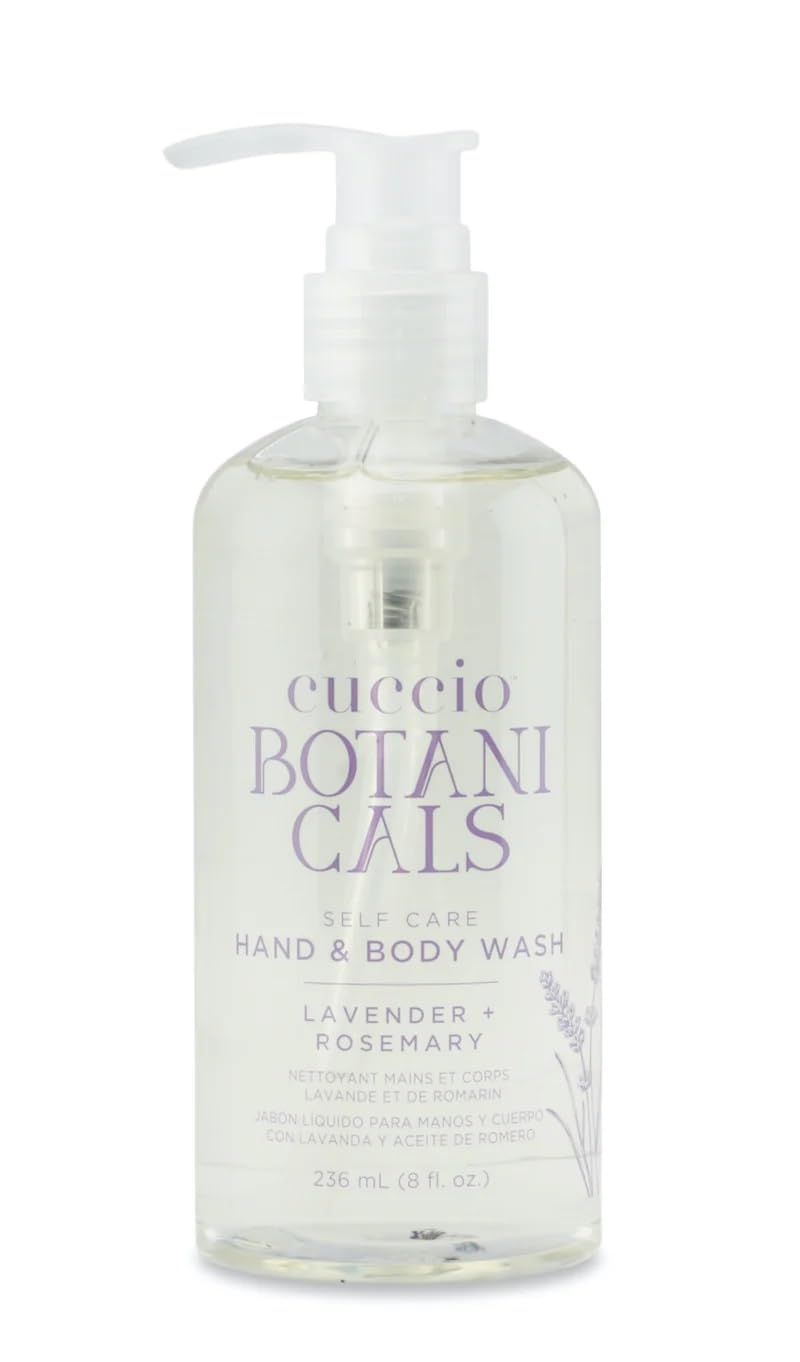 Cuccio Botanicals Hydrating Hand Body Wash in Lavender Rosemary is a luxurious cleanser that combines the natural benefits of lavender and rosemary to hydrate, nourish, and soothe your skin. Designed to gently remove dirt and impurities without stripping moisture, this hand and body wash leaves your skin soft, smooth, and revitalized after every use. The soothing lavender aroma paired with the refreshing notes of rosemary creates a spa-like aromatherapy experience, making it the perfect addition to your self-care routine. Whether you're starting your day with an invigorating cleanse or unwinding at night, this wash offers a moment of relaxation while deeply nourishing your skin. Formulated to be gentle yet effective, this hand and body wash is suitable for all skin types, including dry and sensitive skin. It replenishes the skin's natural hydration while protecting it from environmental stressors, ensuring long-lasting softness and hydration. Packaged in a convenient 8 oz bottle, Cuccio Botanicals Hydrating Hand Body Wash is perfect for daily use in the shower, bath, or at the sink. Crafted with eco-conscious ingredients, it is free from harsh chemicals and is cruelty-free, making it a safe and sustainable choice for your skincare routine. Elevate your cleansing experience with Cuccio Botanicals Hydrating Hand Body Wash, and enjoy the benefits of naturally nourished and beautifully scented skin every day.Gentle Cleansing for All Skin Types: Effectively removes dirt and impurities without stripping the skin's natural moisture, making it perfect for dry, sensitive, or normal skin types. Calming Aromatherapy Experience: The relaxing scent of lavender combined with the invigorating essence of rosemary provides a spa-like aromatherapy experience, perfect for unwinding after a long day. Eco-Friendly and Cruelty-Free Formula: Made with eco-conscious ingredients, this body wash is free from harsh chemicals and never tested on animals, offering a safe and sustainable cleansing option. Perfect for Daily Use: Designed for everyday use, this versatile hand and body wash is ideal for showers, baths, or handwashing, leaving your skin feeling refreshed and hydrated all day. Hydrating and Soothing Formula: Infused with lavender and rosemary extracts, this hand and body wash deeply hydrates and revitalizes the skin, leaving it soft, smooth, and nourished with every use.