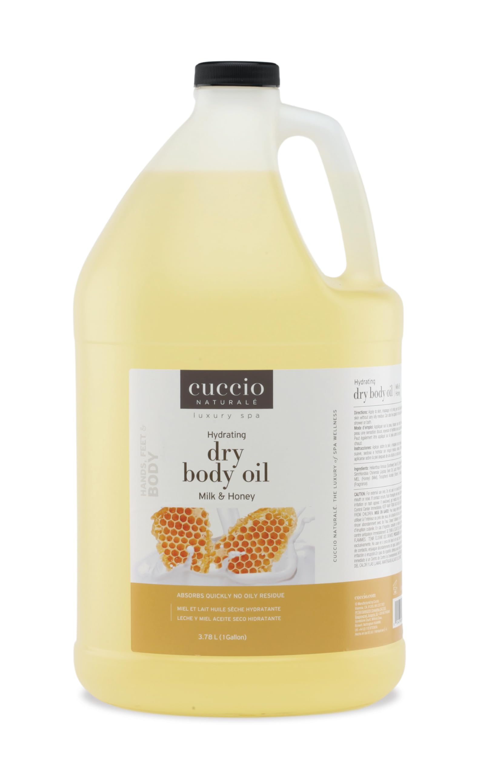 SPA LUXURY WITH SOOTHING SCENT: A signature Cuccio experience with the warm, comforting aroma of Milk Honey. Ideal after showering or for massage, to relax and refresh body and mind. PURE, PARABEN-FREE CRUELTY-FREE FORMULA: Made with clean ingredients and never tested on animals. Suitable for all skin types, including sensitive skin. Trusted by salon professionals. NOURISHING MILK HONEY BLEND: Milk proteins soften and calm the skin, while honey locks in hydration. Infused with sunflower seed oil and botanicals for a healthier, radiant appearance. LIGHTWEIGHT, NON-GREASY HYDRATION: This fast-absorbing dry oil delivers moisture without a slick finish. Skin feels smooth, supple, and comfortably hydrated, with no greasy residue. PROFESSIONAL 1-GALLON REFILL – SALON HOME READY: Enjoy the beloved Milk Honey Dry Body Oil in a 128 oz (1 gallon) bulk refill. Ideal for spa professionals or avid home users, with less waste and more value.