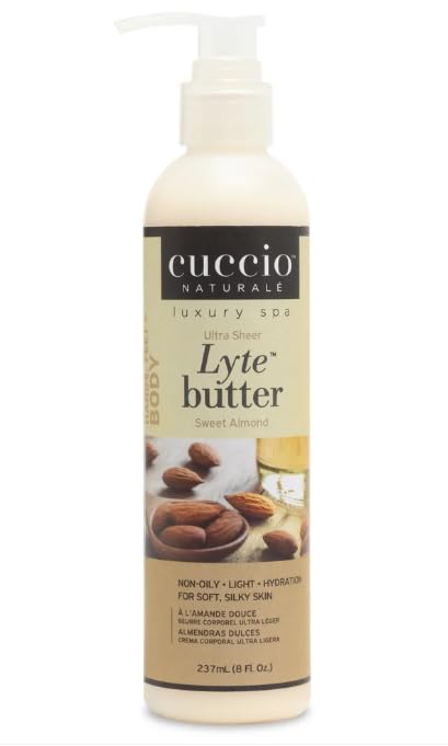 Cuccio Naturale Lyte Ultra Sheer Body Butter in Sweet Almond delivers a spa-quality moisturizing experience in a fast-absorbing, non-greasy formula. Designed for those who want deep hydration without the heaviness of traditional creams, this lightweight body butter penetrates dry, tired skin to leave it feeling soft, nourished, and silky-smooth all day long. Formulated with sweet almond oil, a natural emollient rich in essential fatty acids and Vitamin E, it replenishes lost moisture while supporting skin elasticity and a radiant glow. The addition of time-released humectants ensures continuous hydration for up to 24 hours, making it a reliable solution for dry, flaky, or sensitive skin. Its clean, paraben-free formula is also cruelty-free and safe for daily use on all skin types. The comforting, nutty scent of sweet almond adds a sensory layer to your skincare routine, transforming ordinary moisturizing into a moment of calm and indulgence. Whether used after a shower, before bed, or on-the-go, this 8 oz bottle delivers professional-quality hydration in a compact, convenient format.COMPACT PORTABLE SIZE: The 8 oz bottle is perfect for travel, gym bags, or daily use at home—convenient hydration wherever you go. NON-TOXIC CRUELTY-FREE: Formulated without parabens or harsh chemicals, and never tested on animals—safe for sensitive skin and eco-conscious consumers. 24-HOUR MOISTURE LOCK: Time-released emollients continuously hydrate skin throughout the day, providing long-lasting comfort and relief from dryness. INFUSED WITH SWEET ALMOND OIL: Rich in fatty acids and Vitamin E, this body butter nourishes dry, dull skin and promotes a soft, healthy-looking glow. SILKY LIGHTWEIGHT FORMULA: Fast-absorbing and ultra-sheer, this moisturizer delivers deep hydration with no greasy residue—ideal for daily use on hands, feet, or body.