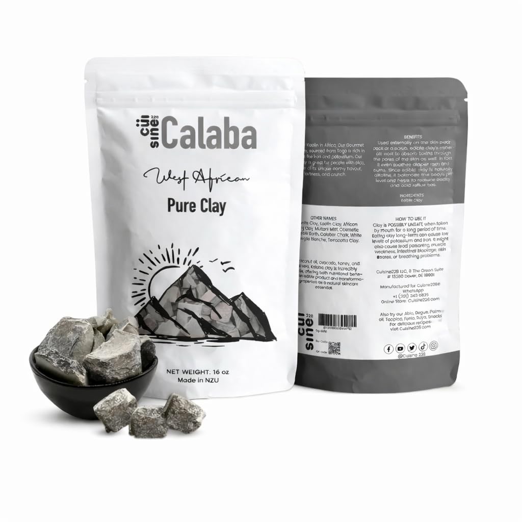 Kaolin, Nzu, Efun, Calabash Chalk, Luti, Ulo, Mabele, Argile, Ayilo, Agata, Shiley, Tabba, Poto. TRUSTED AFRICAN BRAND – CUISINE228 Proudly packaged by Cuisine228, a brand dedicated to preserving West African traditions while delivering authentic, ethically sourced products. ETHICALLY SOURCED – SUPPORTING WOMEN Sourced in partnership with local women and small producers in Togo, helping support sustainable livelihoods and community empowerment. 100 NATURAL AFRICAN CLAY Pure, unprocessed clay with no additives, chemicals, or artificial ingredients. Prepared using traditional methods passed down through generations. AUTHENTIC KALABA FROM TOGO Sustainably sourced Kalaba (Calabash Chalk) from Togo, West Africa. Carefully selected to preserve its natural form and cultural authenticity. Our Calaba is chemical Free.