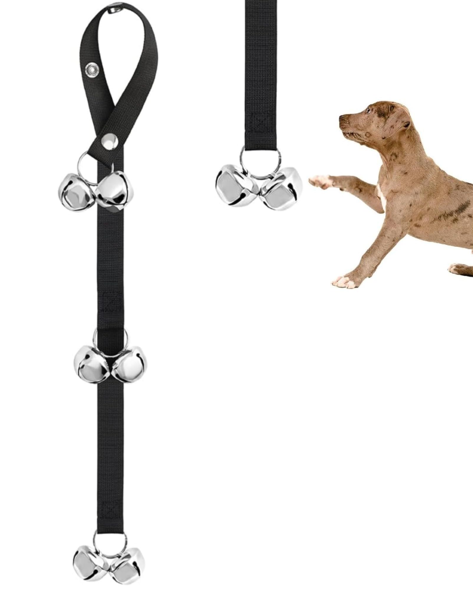 Elegantly designed: With black straps and chrome -plated bells, your dog training bell fits seamlessly into every facility and is a great gift for dog owners.Suitable for all dogs: With 2 buckles that adjust the length between 30 ""and 32"", our training bell is suitable for all types of dog breeds - from small to medium to large.Pleasant sound: Our 7 shiny bells are of quality and create a loud and clear sound that is easy to hear.The bells hang deep on the belt to ensure maximum sound quality so that they do not miss the bell.Easily adjustable: This dog doorbell for the door enables you to individually adjust the length so that you are ideal for every dog.Do the training for the dog toilet with a dog bell stress -free that can easily reach your dog.Extremely hard -wearing: This dog bell for the door is the best choice for strength and durability to facilitate the training of puppies while walking.