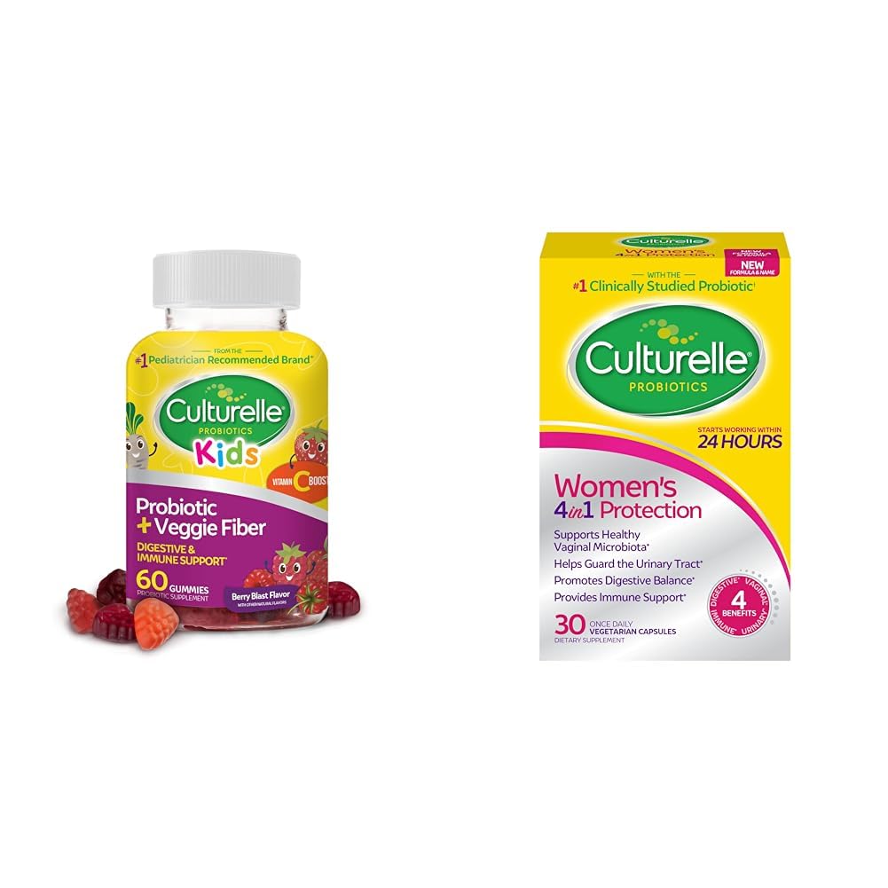 Culturelle Daily Probiotic for Kids Veggie Fiber Gummies (Ages 3 ) - 60 Count - Digestive Health Immune Support – Berry Flavor with a Vitamin C Boost From the 1 Pediatrician recommended probiotic Brand, Culturelle Kids Daily Probiotic Vegetable Fiber Gummies work naturally with your child's body to help them maintain a healthy tummy and help promote a healthy digestive system. Your child's microbiome is essential to their overall health. The bacteria that live in the gut microbiome is linked to digestive health, cognition, mood, and the immune system. Culturelle Kids Daily Probiotic Gummies are formulated to support a healthy microbiome. Culturelle Kids Daily Probiotic Gummies contain 1 billion CFUs of high survivability good bacteria. The probiotic strain in Culturelle Kids Daily Probiotic Gummies was specifically selected to ensure great taste, texture and efficacy. Culturelle Kids Daily Probiotic Gummies are packed with great tasting flavor that your little ones will love. They are easy to take. Your child, age 3 and up, can enjoy one (1) gummy daily at any time of day. Trust your child's gut to Culturelle. Culturelle Women's 4-in-1 Daily Probiotic Supplements for Women - Supports Vaginal Health, Digestive Health, Immune Health, Occasional Diarrhea And Gas - Non-GMO - 30 Count Culturelle Women's 4 in 1 Protection daily probiotic is a unique blend of proven probiotics designed specifically for women. It combines the proven effective probiotic strain, Lactobacillus rhamnosus GG, and the four powerful lactobacilli most dominant in healthy women. As a result, Culturelle Women's 4 in 1 Protection helps maintain digestive, immune, feminine and overall health. We cannot claim Culturelle Women's 4-in-1 is safe for pregnant women. The new prebiotic ingredient was not studied in pregnant women.Product 2: HELP ACHIEVE BALANCE - Women know that the stresses of daily life can take a toll on your body. Women want a daily probiotic that can help keep the female body in balance, helping protect it from the inside out. . Product 2: FOR A WOMAN'S SPECIFIC NEEDS - A multi-strain probiotic blend for women that works naturally with your body to support vaginal, urinary digestive and immune health in a convenient once daily capsule. For optimal results, continued daily use is suggested. Product 2: PROVEN EFFECTIVE Culturelle Women's 4 in 1 Protection is powered by a unique blend of proven probiotics designed for a woman's specific needs. This blend includes the LGG strain. Product 2: PROBIOTICS MADE JUST FOR WOMEN - Culturelle Women's 4 in 1 Protection contains five clinically proven strains, setting it apart from other probiotics for women. This unique blend helps maintain a healthy balance of good bacteria in your body. . Product 1: SAFE and EASY TO TAKE: Chew one (1) berry flavored Culturelle Kids plus Veggie Fiber Gummy, 1 to 2 times a day taken with or without food at any time of the day. Product 1: SUPPORTS A HEALTHY MICROBIOME: Your child's microbiome is essential to their overall health. The bacteria that live in the gut microbiome is linked to digestive health, cognition, mood, and the immune system. Product 1: PROVEN PROBIOTIC STRAINS Formulated with a unique blend of probiotics and prebiotic veggie fiber, these naturally flavored gummies work to harness the power of your kid's gastrointestinal microbiome. Product 1: FROM THE PEDIATRICIAN RECOMMENDED PROBIOTIC BRAND: Culturelle Kids Veggie Fiber Gummies plus Probiotic helps support healthy growth and development of your child. Contains fiber for digestive health.