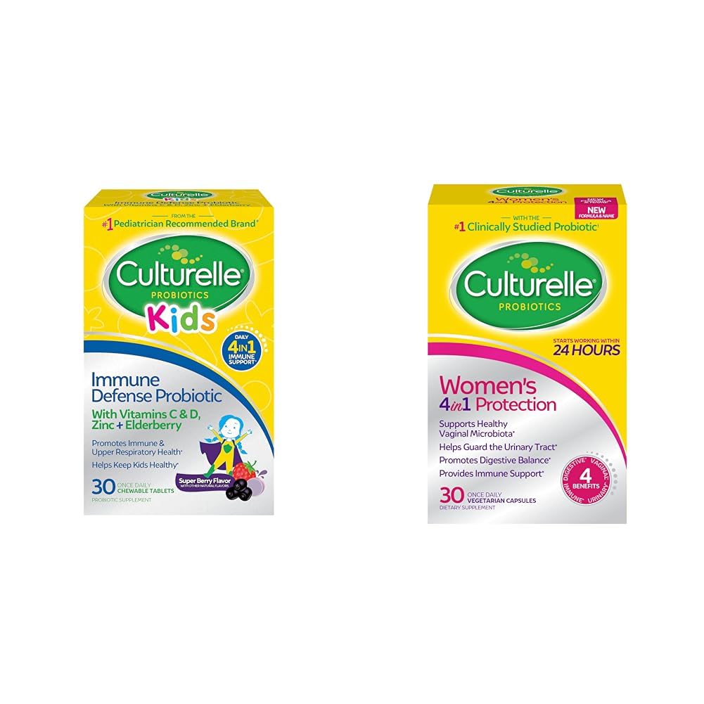 Culturelle Immune Defense Probiotic with Vitamin C, Vitamin D and Zinc Elderberry, Non-GMO, 4-in-1 Immune Support for Kids Ages 3 , Mixed Berry Chewables, 30 Count Culturelle Kids Probiotic Chewables use the power of a clinically proven probiotic, vitamin C, vitamin D, zinc and elderberry to help protect their immune health and help keep your kids healthy for whatever their day may bring. These powerful ingredients are packed into once daily super immunity chewable. Culturelle Kids Immune Defense Chewables are powered by 5 billion CFU's of Lactobacillus rhamnosus GG probiotic. Over 1,000 scientific studies and 30 years of research have demonstrated the safety and efficacy of this probiotic strain, Lactobacillus rhamnosus GG. In addition to the Lactobacillus rhamnosus GG strain, the super immunity kids chewables contain an good source of Vitamin C, Vitamin D and Zinc are made from naturally-sourced Elderberry fruit juice, an ancient superfood. Culturelle Women's 4-in-1 Daily Probiotic Supplements for Women - Supports Vaginal Health, Digestive Health, Immune Health, Occasional Diarrhea And Gas - Non-GMO - 30 Count Culturelle Women's 4 in 1 Protection daily probiotic is a unique blend of proven probiotics designed specifically for women. It combines the proven effective probiotic strain, Lactobacillus rhamnosus GG, and the four powerful lactobacilli most dominant in healthy women. As a result, Culturelle Women's 4 in 1 Protection helps maintain digestive, immune, feminine and overall health. We cannot claim Culturelle Women's 4-in-1 is safe for pregnant women. The new prebiotic ingredient was not studied in pregnant women.Product 2: HELP ACHIEVE BALANCE - Women know that the stresses of daily life can take a toll on your body. Women want a daily probiotic that can help keep the female body in balance, helping protect it from the inside out. . Product 2: FOR A WOMAN'S SPECIFIC NEEDS - A multi-strain probiotic blend for women that works naturally with your body to support vaginal, urinary digestive and immune health in a convenient once daily capsule. For optimal results, continued daily use is suggested. Product 2: PROVEN EFFECTIVE Culturelle Women's 4 in 1 Protection is powered by a unique blend of proven probiotics designed for a woman's specific needs. This blend includes the LGG strain. Product 2: PROBIOTICS MADE JUST FOR WOMEN - Culturelle Women's 4 in 1 Protection contains five clinically proven strains, setting it apart from other probiotics for women. This unique blend helps maintain a healthy balance of good bacteria in your body. . Product 1: SAFE EASY TO TAKE: Mouthwatering fruit punch flavor tested approved by kids. Chew one (1) Culturelle Immune Defense Probiotic for Kids tablet daily can be taken with or without food at any time of the day. Product 1: MULTI BENEFIT FORMULA: Culturelle Kids Immune Defense Probiotics made with real elderberry fruit, Zinc, Vitamin C and Vitamin D tasty and convenient chewables that help support your child's immune system. Product 1: PROVEN PROBIOTIC STRAIN: The key strain in Culturelle Kids Immune Defense Probiotic For Kids, Lactobacillus rhamnosus GG (LGG) - clinically proven to help with occasional tummy troubles, like diarrhea and occasional digestive upset. Product 1: FROM THE PEDIATRICIAN RECOMMENDED PROBIOTIC BRAND: Culturelle Immune Defense Probiotic For Kids helps keep little ones feeling their best all year long formulated with a powerful blend of scientifically-proven probiotics Zinc, Vitamins C D plus naturally-sourced elderberry.