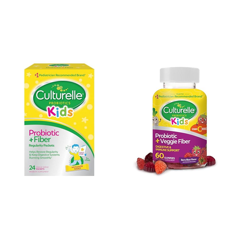 The Culturelle Kids Probiotic Bundle includes two complementary products to support your child's digestive health and immune system. The bundle contains Culturelle Kids Probiotic Fiber Packets and Culturelle Daily Probiotic for Kids Veggie Fiber Gummies. The Probiotic Fiber Packets provide 2.5 billion CFUs of the clinically studied probiotic Lactobacillus rhamnosus GG to promote digestive regularity. They also contain 3.5 grams of fiber from natural wheat, fruit and vegetable sources. The berry flavored gummies have a blend of probiotics and prebiotic vegetable fiber to support the gastrointestinal microbiome. Both products contain proven ingredients and strains selected for efficacy, taste and texture. Culturelle is the 1 pediatrician recommended probiotic brand. Their safe, non-GMO formulas work naturally with your child's body to maintain digestive balance and immune defenses. The good bacteria support the gut microbiome which impacts digestive health, cognition, mood and immunity. The packets and gummies perfectly complement each other to provide a complete probiotic and fiber supplement. Give your child one packet up to three times daily mixed with food, and one to two gummies anytime. The berry gummies provide a tasty probiotic boost while the unflavored packets conveniently mix into meals. Together they offer comprehensive digestive and immune support for kids ages 3 and up.