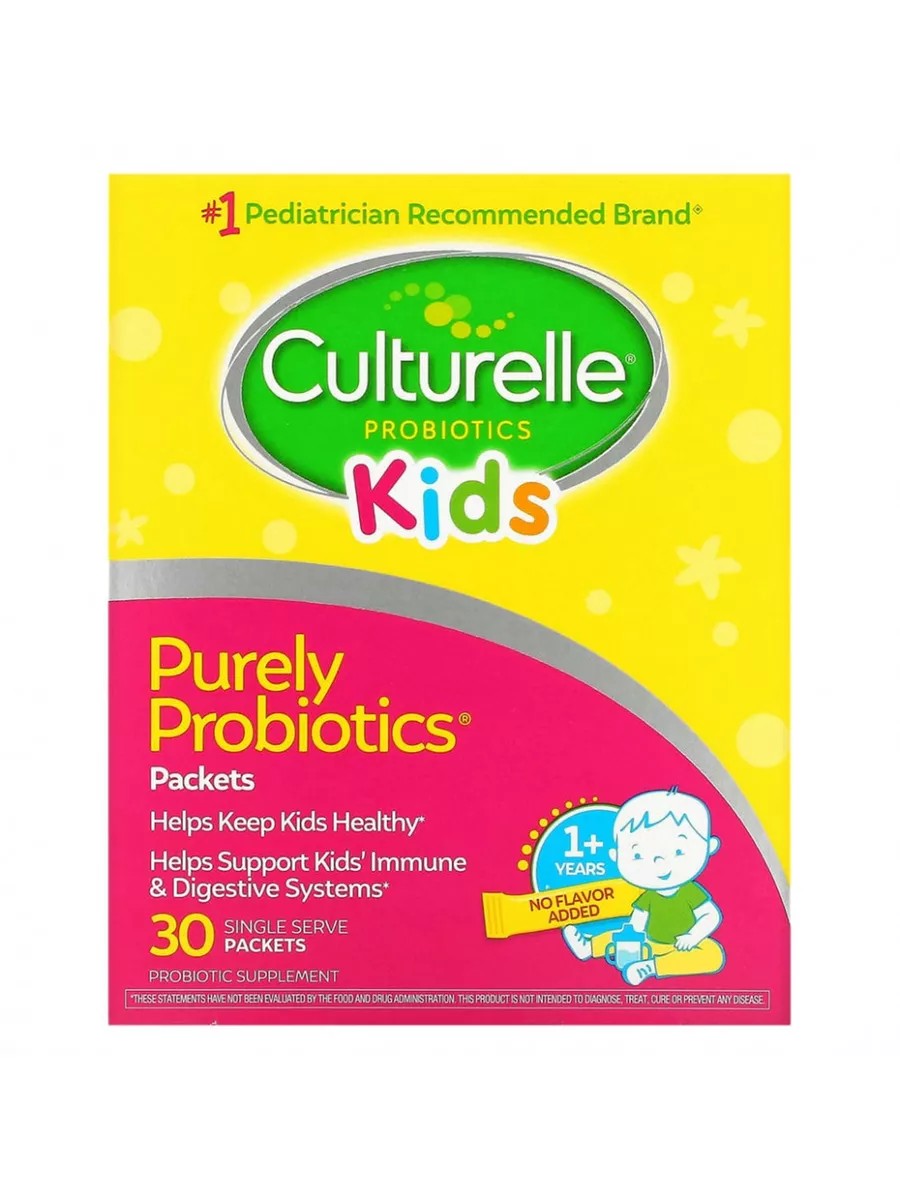 Culturelle Probiotics for Kids 1+:* Supports natural immune defenses* Promotes digestive health* Unflavored* Naturally sourced LGG* The most studied strain in kids* Guaranteed purity and potency* Free from dairy, gluten, and soy. Directions: Take 1 packet any time of day, with or without food. Mix entire contents of packet with a cool food or drink. For best results, take daily as directed. For occasional digestive upset, you may want to take 2 packets. If taking 2 packets, take 1 in the morning and 1 in the evening. If symptoms persist, consult a physician. Before using any dietary supplements if you are pregnant, planning a pregnancy, breastfeeding, taking medications, have a medical condition, or planning surgery, consult a physician. Use as directed, following the instructions, or as directed by a physician. Do not use if safety seal is damaged or missing. Do not exceed the recommended dosage. If any adverse reactions occur, discontinue use and consult a physician. The manufacturer reserves the right to change the packaging, product composition, flavors, and consistency. We strive to monitor changes, but if you notice any discrepancies, please let us know in the product comments. Thank you!