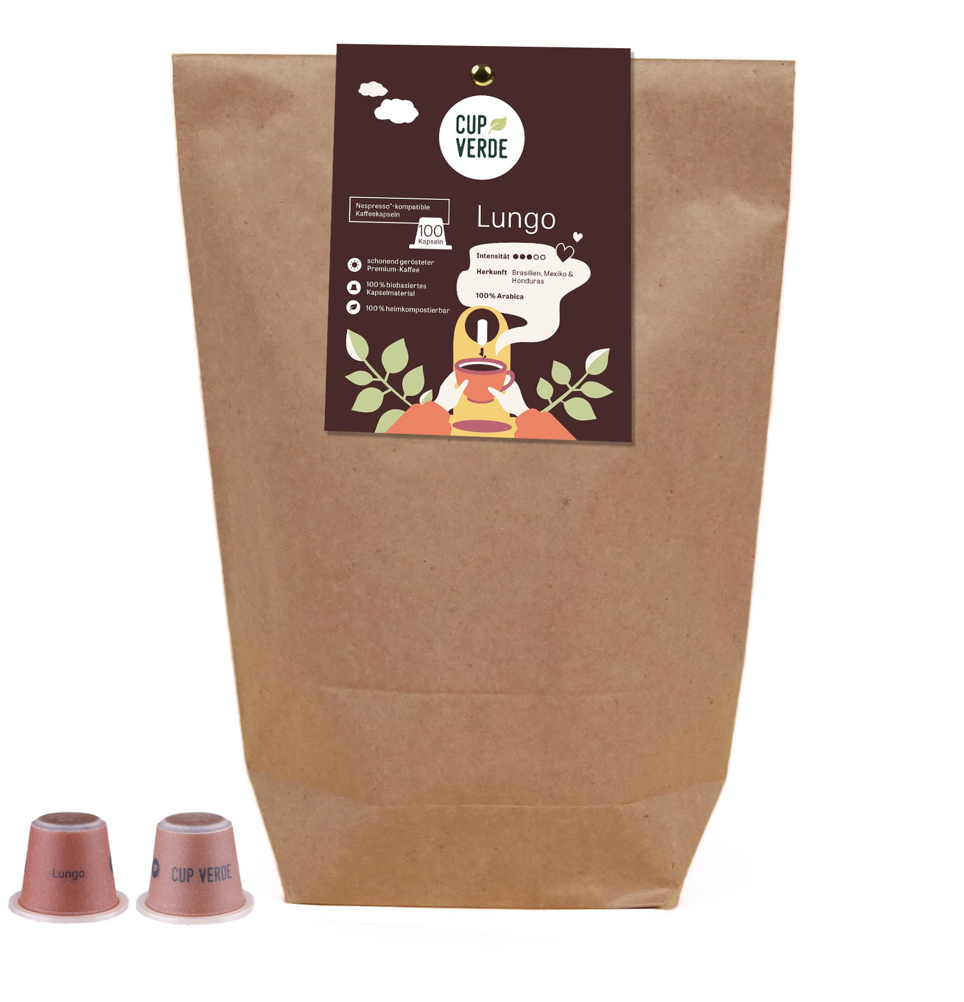 CUP VERDE 100 sustainable coffee capsules Nespresso* compatible. 100% climate neutral - fairly traded - gently roasted strong taste - little packaging. Long