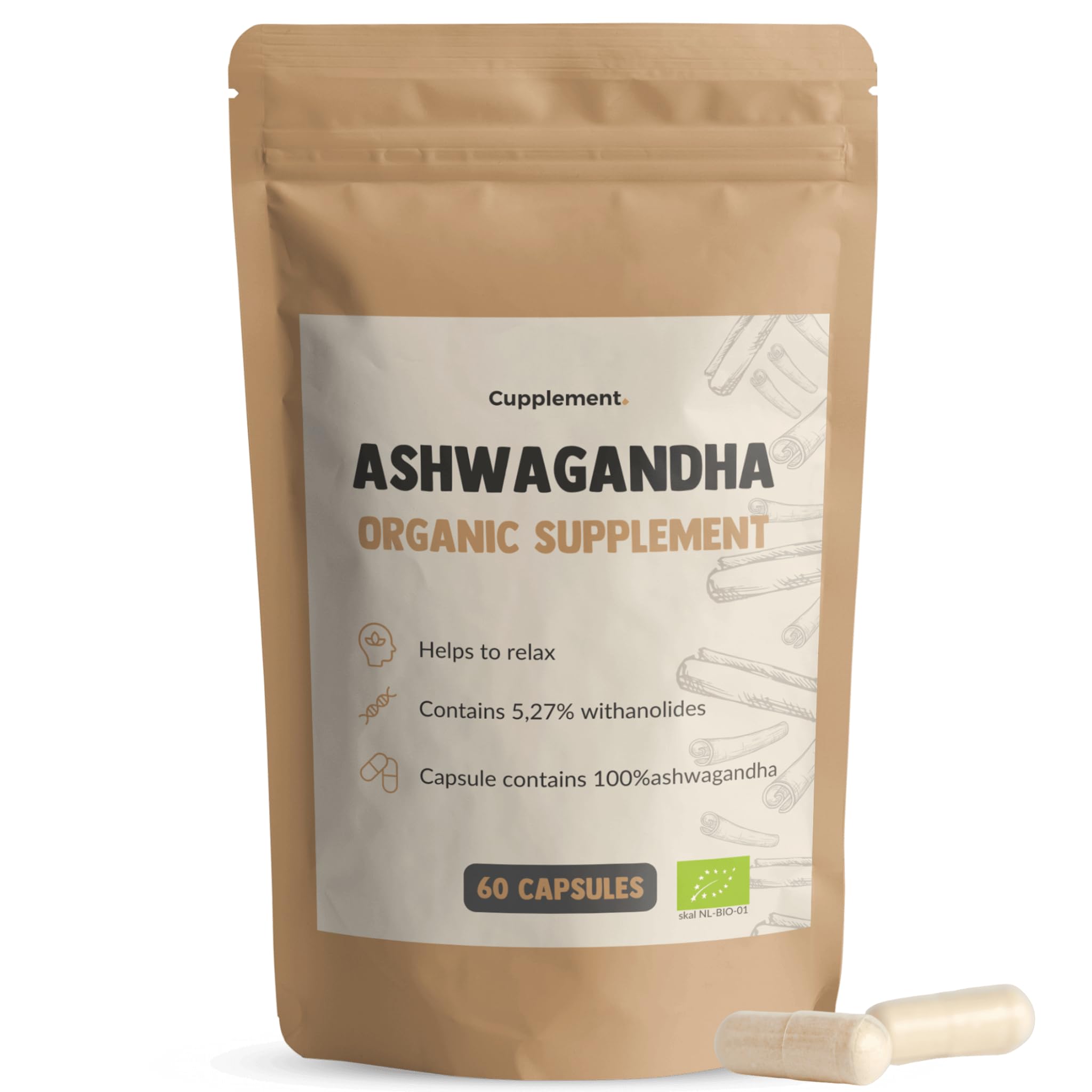 Transform your health and wellness routine with our Organic Ashwagandha Capsules (500 mg per capsule, 60 capsules), made from the finest hand-selected ashwagandha roots grown in India. This powerful adaptogenic herb has been used for thousands of years in Ayurvedic medicine to support stress management, boost energy and stamina, and improve overall well-being. Our Organic Ashwagandha Powder is carefully processed to retain all the vital nutrients and compounds, so you can enjoy all the benefits of this powerful superfood. Certified organic and free from harmful chemicals or additives, our Ashwagandha Powder is the perfect choice for those who prioritize both health and sustainability. INGREDIENTS Ashwagandha Powder (100 Pure)QUALITY GUARANTEE: Cupplement stands for quality health products that help you lead an energetic life. Our products come from reliable suppliers who adhere to the highest standards. We offer a 100 money-back guarantee. ASHWAGANDHA AND CAFFEINE: Ashwagandha and other adaptogens are ideal in combination with coffee. Caffeine gives your body more energy and focus, but it can also cause stress. Ashwagandha powder reduces this stress. This keeps the energy from caffeine, but not the stress. In addition, ashwagandha has been shown to improve sleep. HIGHEST QUALITY: Cupplement stands for healthy products of the highest quality. This ashwagandha powder contains 5.27 withanolide. The selected natural products come from different regions of the world. All products are checked and packaged in Europe. The ingredients are free from additives such as sugars and fats and comply with all European pesticide requirements. PURE ASHWAGANDHA: Ashwagandha is a plant found primarily in Asia and parts of Africa. Ashwagandha is a plant whose root is primarily used as an adaptogen and antioxidant. Adaptogens are natural, non-toxic substances that can adapt their function to the body's specific needs. Adaptogens increase resistance and can help with stress, anxiety, fatigue, and overall well-being. Transformez votre routine de santé et de bien-être avec nos gélules d'ashwagandha biologique (500 mg par gélule, 60 gélules), fabriquées à partir des meilleures racines d'ashwagandha cultivées en Inde et sélectionnées à la main. Cette puissante plante adaptogène est utilisée depuis des milliers d'années dans la médecine ayurvédique pour favoriser la gestion du stress, stimuler l'énergie et l'endurance et améliorer le bien-être général. Notre poudre d'ashwagandha biologique est soigneusement traitée pour conserver tous les nutriments et composés vitaux, afin que vous puissiez profiter de tous les bienfaits de ce puissant superaliment. Certifiée biologique et exempte de produits chimiques ou d'additifs nocifs, notre poudre d'ashwagandha est le choix idéal pour ceux qui privilégient à la fois la santé et la durabilité. INGRÉDIENTS Poudre d'ashwagandha (100 pure)GARANTIE DE QUALITÉ : Cupplement est synonyme de produits de santé de qualité qui vous aident à mener une vie pleine d'énergie. Nos produits proviennent de fournisseurs fiables qui respectent les normes les plus strictes. Nous offrons une garantie de remboursement à 100 . ASHWAGANDHA ET CAFEÏNE : L'ashwagandha et d'autres adaptogènes sont idéaux en combinaison avec le café. La caféine donne à votre corps plus d'énergie et de concentration, mais elle peut aussi causer du stress. La poudre d'ashwagandha diminue ce stress. Vous conservez ainsi l'énergie de la caféine, mais pas le stress. En outre, il a été démontré que l'ashwagandha améliore le sommeil. LA PLUS HAUTE QUALITÉ : Cupplement est synonyme de produits sains et de la plus haute qualité. Cette poudre d'ashwagandha contient 5,27 de withanolide. Les produits naturels sélectionnés proviennent de différentes régions du monde. Tous les produits sont contrôlés et emballés en Europe. Les ingrédients sont exempts d'additifs tels que les sucres, les graisses et sont conformes à toutes les exigences européennes en matière de pesticides. PURE ASHWAGANDHA : L'ashwagandha est une plante que l'on trouve principalement en Asie et dans certaines régions d'Afrique. L'ashwagandha est une plante dont la racine est principalement utilisée comme adaptogène et antioxydant. Les adaptogènes sont des substances naturelles non toxiques qui peuvent adapter leur fonction aux besoins spécifiques de l'organisme. Les adaptogènes augmentent la résistance, peuvent aider à lutter contre le stress, l'anxiété, la fatigue et le bien-être général.