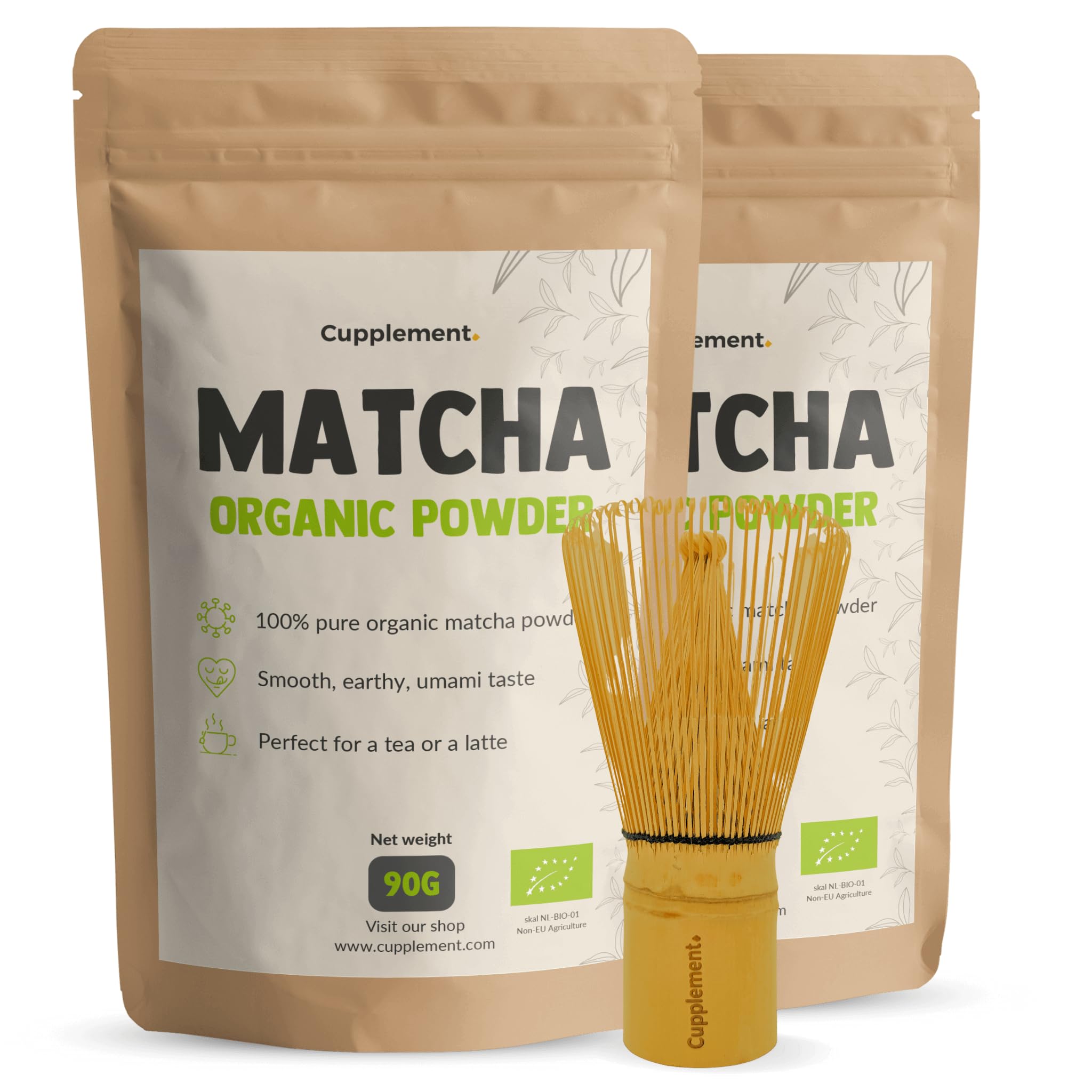 Cupplement Matcha Poeder met Matcha Whisk Combideal 2x 90 gram 1 klopper - Biologische - Thee klopper – Energie Matcha 3 delige set