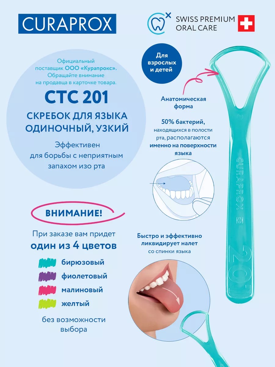 Скребок для языка Curaprox - это удобный и эффективный инструмент для ухода за полостью рта. Он подходит как взрослым, так и детям благодаря своей мягкой, пластиковой конструкции.
