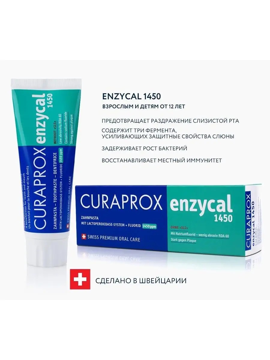 Зубная паста для взрослых и подростков с 12 лет. Подходит для чувствительных зубов и обычных. Зубная паста Curaprox Enzycal 1450 со фтором сохраняет естественную микрофлору полости рта. Курапрокс чистит зубы от налёта защищая поверхность эмали от кариеса. Профессиональная чистка вам обеспечена. В составе есть натуральная составляющая, экстракт водоросли. Массовая доля фторида натрия: 1450 ppm.Она лечебная- профилактическая с ферментами для всей семьи, порадует мужчин и женщин. Подходит для обычных и электрических щеток за счет RDA равного 60. Предотвращает раздражение слизистой рта, снижает риск возникновения аллергических реакций, стоматитов. В одной тубе номинального количество 75мл, производит Швейцария. Она обладает редкими свойствами: борется с сухостью слизистой, кариесом, защищает иммунитет полости рта, задерживает рост бактерий, не требует смывания и безопасна при глотании. Ферменты усиливают защитные свойства слюны.
