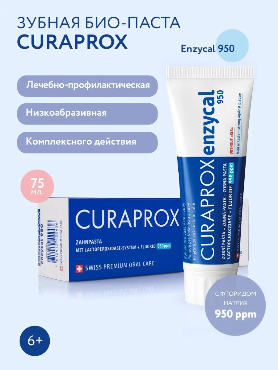 CURAPROX Enzycal - лечебно-профилактическая зубная паста, в основе действия которой лежат уникальные технологии защиты от кариеса. Enzycal - настоящий швейцарский продукт. Зубная паста работает так же, как иммунитет человека. Все её компоненты входят в состав биологических жидкостей организма - слюны, грудного молока, слез. Паста обладает широким спектром действия. Лактопероксидазная система зубной пасты Enzycal обладает преимуществами в сравнении с традиционными ферментными зубными пастами в силу своей природности, безопасности и эффективности. Зубная паста детская поддерживает иммунный баланс полости рта, усиливает антибактериальное, реминерализующее, очищающее действие слюны. CURAPROX Enzycal 950 - мягкая зубная паста против кариеса со сниженным содержанием фторида натрия (всего 950 ppm). Индекс абразивности зубной пасты (RDA) - всего 30. 3 основных преимущества зубной пасты CURAPROX Enzycal: Содержит 3 важных фермента: амилоглюкозидазу, глюкозооксидазу, лактопероксидазу. Они помогают ферментам, содержащимся в нашей слюне противостоять губительным микроорганизмам. Кроме того, они поддерживают чистящий эффект и процессы реминерализации. CURAPROX Enzycal содержит биодоступную форму фтора, благодаря которой он проникает в микротрещины в зубной эмали и устраняет меловые пятна - первые признаки кариеса. Натуральная зубная паста насыщает эмаль ионами кальция и фтора, делая её плотной и крепкой. Благодаря действию Enzycal Ваши зубы становятся недоступными для кислотообразующих бактерий, обитающих в полости рта, а следовательно, устойчивыми к кариесу. Не содержит SLS (лаурилсульфат натрия), парабены, сульфаты, ароматизаторы, красители и другие химически активные агрессивные вещества.